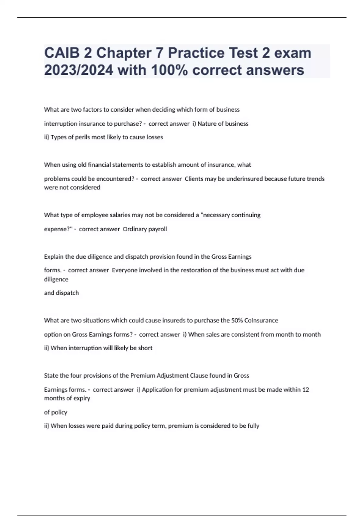What are two factors to consider when deciding which form of business interruption insurance to purchase? - correct answer i) Nature of business ii) Types of perils most likely to cause losses When using old financial statements to establish amount of insurance, what problems could be encountered? - correct answer Clients may be underinsured because future trends were not considered What type of employee salaries may not be considered a "necessary continuing expense?" - correct answer Ordinary payroll Explain the due diligence and dispatch provision found in the Gross Earnings forms. - correct answer Everyone involved in the restoration of the business must act with due diligence and dispatch What are two situations which could cause insureds to purchase the 50% CoInsurance option on Gross Earnings forms? - correct answer i) When sales are consistent from month to month ii) When interruption will likely be short State the four provisions of the Premium Adjustment Clause found in Gross Earnings forms. - correct answer i) Application for premium adjustment must be made within 12 months of expiry of policy ii) When losses were paid during policy term, premium is considered to be fully earned iii) 50% Co-insurance basis forms are eligible for refunds up to 25% of premium iv) 80% Co-insurance basis forms are eligible for refunds up to 50% of premium When will payment be made when there has been an Interruption by Civil Authority? - correct answer This coverage is available only when there has been damage to neighbouring premises from a peril insured under insured's policy resulting in access being denied by civil authority How long will coverage be provided when there is an Interruption by Civil Authority? - correct answer Coverage is available for two weeks when access is prohibited by order of civil authority Explain the Due Diligence and Dispatch provision of the Profits forms. - correct answer Only clients are required to exercise due, diligence and dispatch Describe how claims are paid with the Monthly Earnings Endorsement forms - correct answer Claims are limited to 25% of the amount of insurance for any 30 consecutive calendar days Define Contributing Properties - correct answer These are properties clients are dependent upon to supply materials or goods Define Recipient Properties. - correct answer These are properties clients are dependent upon to purchase