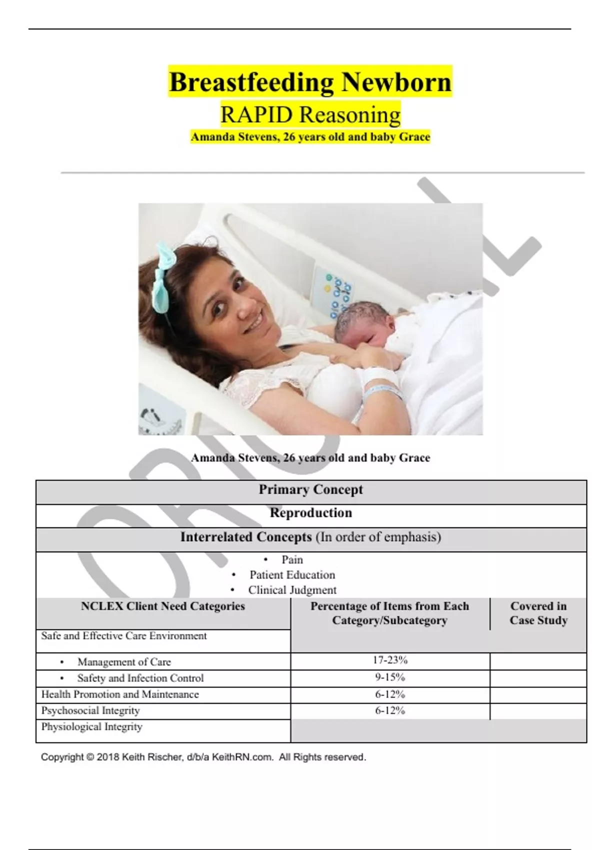 Breastfeeding Newborn RAPID Reasoning Amanda Stevens, 26 years old and baby Grace Amanda Stevens, 26 years old and baby Grace Primary Concept Reproduction Interrelated Concepts (In order of emphasis) • Pain • Patient Education • Clinical Judgment NCLEX Client Need Categories Percentage of Items from Each Category/Subcategory Covered in Case Study Safe and Effective Care Environment • Management of Care 17-23% • Safety and Infection Control 9-15% Health Promotion and Maintenance 6-12% Psychosocial Integrity 6-12% Physiological Integrity Copyright © 2018 Keith Rischer, d/b/a KeithRN.com. All Rights reserved. • Basic Care and Comfort 6-12% • Pharmacological and Parenteral Therapies 12-18% • Reduction of Risk Potential 9-15% • Physiological Adaptation 11-17% History of Present Problem: Amanda Stevens is a 26-year-old female, G1 P1, accompanied by her husband, Brad. She presented to the maternity unit complaining of contractions every five minutes for the past three hours. She was dilated to 6 cm, 50% effaced, -2 station and admitted for labor. Brad was very supportive throughout her labor. She received an epidural for pain control and delivered by spontaneous vaginal delivery (SVD) a baby girl 12 hours later at 39 5/7 weeks gestation. Amanda’s blood type is A+ and is Group B strep (GBS) negative. Baby Grace was 7 pounds 8 ounces (3.4 kg), 20 inches (50.8 cm) long with APGARS of 9 at one minute and 9 at 5 minutes. Delayed cord clamping for one minute occurred and then she immediately went to breast and latched with minimal assist and nursed for ten minutes. Initial newborn assessment was completed with no abnormal findings. Her vital signs at birth were HR: 158, R: 54 T: 98.1 F/36.7 C axillary. Personal/Social History: Amanda and Brad have been married for two years and live 15 miles from the hospital in a small, rural community. Brad is a security guard at a prison located 30 miles from home and Amanda is a preschool teacher for the local preschool in her town. She will be taking eight weeks off from work before returning full time. Amanda’s parents live two hours away and will be coming tomorrow to stay with Amanda for a few days when she and the baby are discharged. Brad’s parents live out of state and will be coming to visit next month. Amanda’s sister lives an hour away and has a toddler and has offered to help Amanda if she needs it. Amanda and Brad just moved to their home six months ago and do not have many friends in the area. What data from the histories are RELEVANT and must be interpreted as clinically significant by the nurse? RELEVANT Data from Present Problem: Clinical Significance: RELEVANT Data from Social History: Clinical Significance: Patient Care