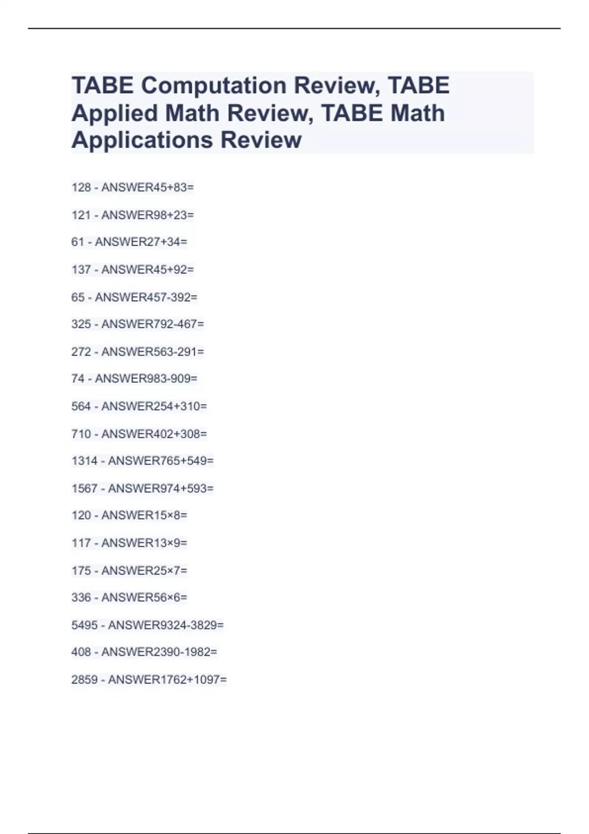 TABE Computation Review, TABE Applied Math Review, TABE Math Applications Review.Questions and answers 2023