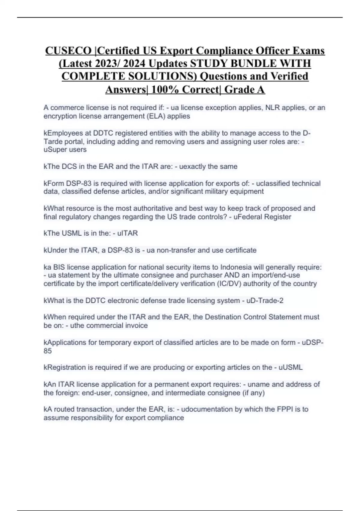 CUSECO |Certified US Export Compliance Officer Exams (Latest 2023/ 2024 Updates STUDY BUNDLE WITH COMPLETE SOLUTIONS) Questions and Verified Answers| 100% Correct| Grade A
