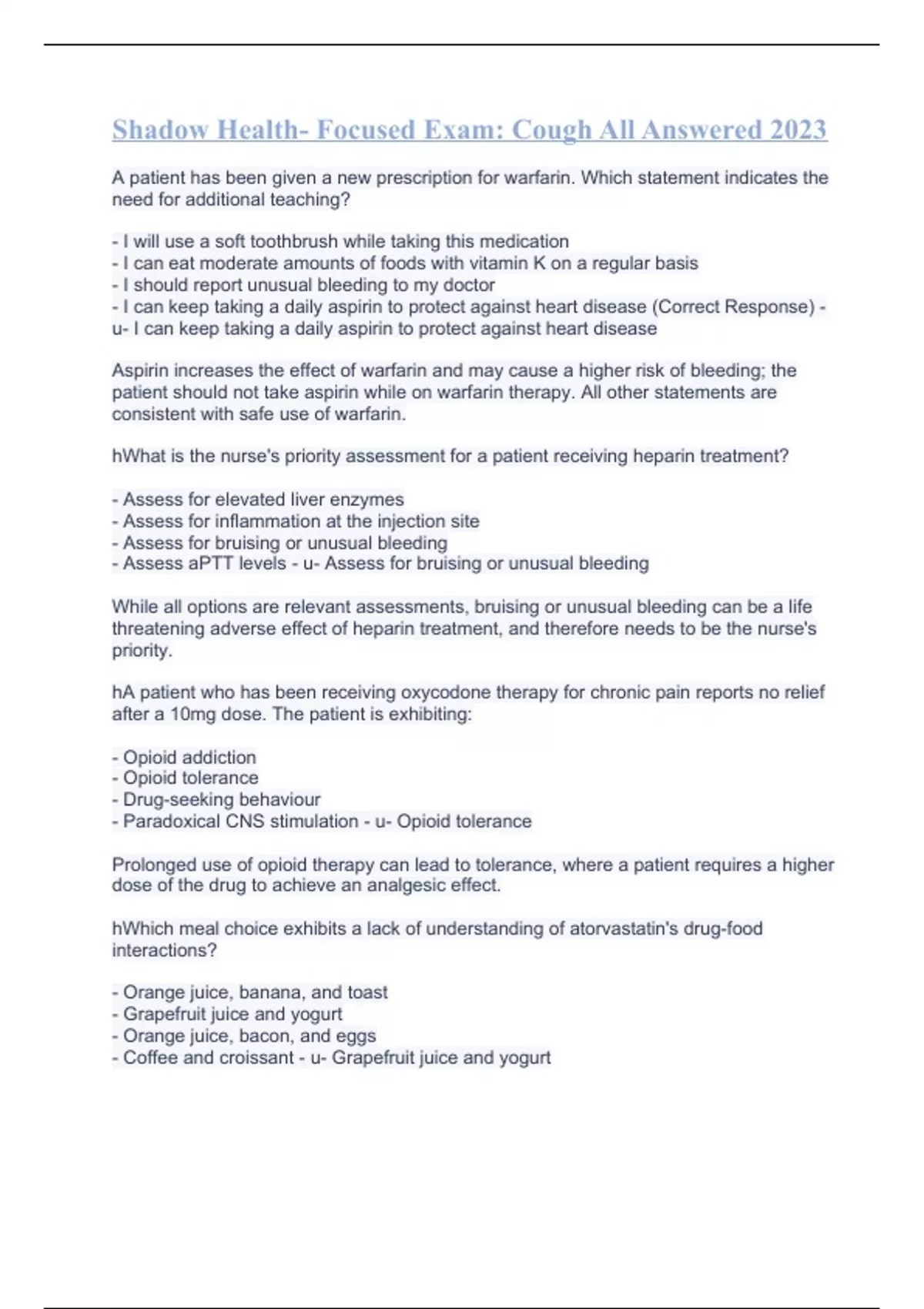 A patient has been given a new prescription for warfarin. Which statement indicates the need for additional teaching? - I will use a soft toothbrush while taking this medication - I can eat moderate amounts of foods with vitamin K on a regular basis - I should report unusual bleeding to my doctor - I can keep taking a daily aspirin to protect against heart disease (Correct Response) - u- I can keep taking a daily aspirin to protect against heart disease Aspirin increases the effect of warfarin and may cause a higher risk of bleeding; the patient should not take aspirin while on warfarin therapy. All other statements are consistent with safe use of warfarin. hWhat is the nurse's priority assessment for a patient receiving heparin treatment? - Assess for elevated liver enzymes - Assess for inflammation at the injection site - Assess for bruising or unusual bleeding - Assess aPTT levels - u- Assess for bruising or unusual bleeding While all options are relevant assessments, bruising or unusual bleeding can be a life threatening adverse effect of heparin treatment, and therefore needs to be the nurse's priority. hA patient who has been receiving oxycodone therapy for chronic pain reports no relief after a 10mg dose. The patient is exhibiting: - Opioid addiction - Opioid tolerance - Drug-seeking behaviour - Paradoxical CNS stimulation - u- Opioid tolerance Prolonged use of opioid therapy can lead to tolerance, where a patient requires a higher dose of the drug to achieve an analgesic effect. hWhich meal choice exhibits a lack of understanding of atorvastatin's drug-food interactions? - Orange juice, banana, and toast - Grapefruit juice and yogurt - Orange juice, bacon, and eggs - Coffee and croissant - u- Grapefruit juice and yogurt Grapefruit juice is contraindicated for patients on statin therapy and it may increase drug levels in the blood and increase the likelihood of rhabdomyolysis. None of the other choices interact harmfully with atorvastatin. hWhich statement indicates that the patient understood the nurse's discharge information about his albuterol inhaler? - I should use this inhaler five minutes after my beclomethasone inhaler - I should use this inhaler regularly to manage my asthma - I should use this inhaler when I am having an acute attack - I should use this inhaler to reduce inflammation in my airways - u- I should use this inhaler when I am having an acute attack Inhaled albuterol is a rescue medication that reduces bronchoconstriction that is present during acute attacks; it has no effect on inflammation. hA patient is taking promethazine for nausea and oxycodone for pain. What is the nurse's priority assessment? - Assess for breakthrough pain - Assess sedation level - Assess for constipation - Assess for dizziness - u- Assess sedation level The nurse must assess sedation level as the additive sedative effect when promethazine and oxycodone are administered together can lead to life-threatening respiratory depression. The other side effects do not pose immediate risk and are therefore lower-priority assessments. hWhich information is essential to include when educating the patient about clindamycin? - Clindamycin is primarily bacteriostatic - Clindamycin should be continued even when feeling better - Clindamycin can be given to patients with penicillin sensitivities - Clindamycin can cause a harmless bitter taste - u- Clindamycin should be continued even when feeling better To resolve the infection and prevent the development of resistant pathogens, it is important that the patient understands she must take an entire course of antibiotics even if she is feeling better. hA patient with a penicillin allergy needs antibiotic treatment. Which antibiotic choice would require close monitoring for hypersensitivity due to cross sensitivity? - vancomycin - azithromycin