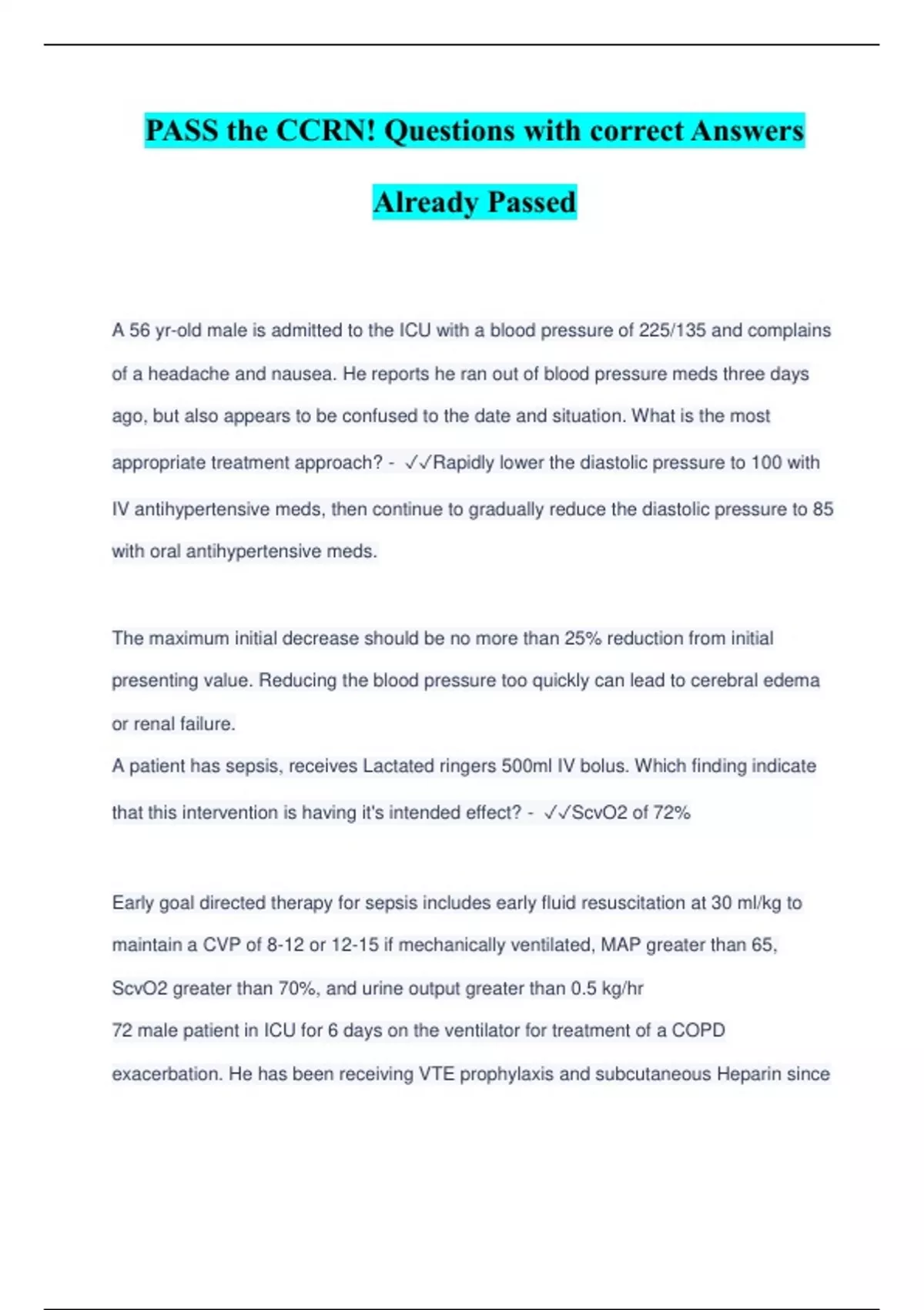 PASS the CCRN! Questions with correct Answers Already Passed A 56 yr-old male is admitted to the ICU with a blood pressure of 225/135 and complains of a headache and nausea. He reports he ran out of blood pressure meds three days ago, but also appears to be confused to the date and situation. What is the most appropriate treatment approach? - Rapidly lower the diastolic pressure to 100 with IV antihypertensive meds, then continue to gradually reduce the diastolic pressure to 85 with oral antihypertensive meds. The maximum initial decrease should be no more than 25% reduction from initial presenting value. Reducing the blood pressure too quickly can lead to cerebral edema or renal failure. A patient has sepsis, receives Lactated ringers 500ml IV bolus. Which finding indicate that this intervention is having it's intended effect? - ScvO2 of 72% Early goal directed therapy for sepsis includes early fluid resuscitation at 30 ml/kg to maintain a CVP of 8-12 or 12-15 if mechanically ventilated, MAP greater than 65, ScvO2 greater than 70%, and urine output greater than 0.5 kg/hr 72 male patient in ICU for 6 days on the ventilator for treatment of a COPD exacerbation. He has been receiving