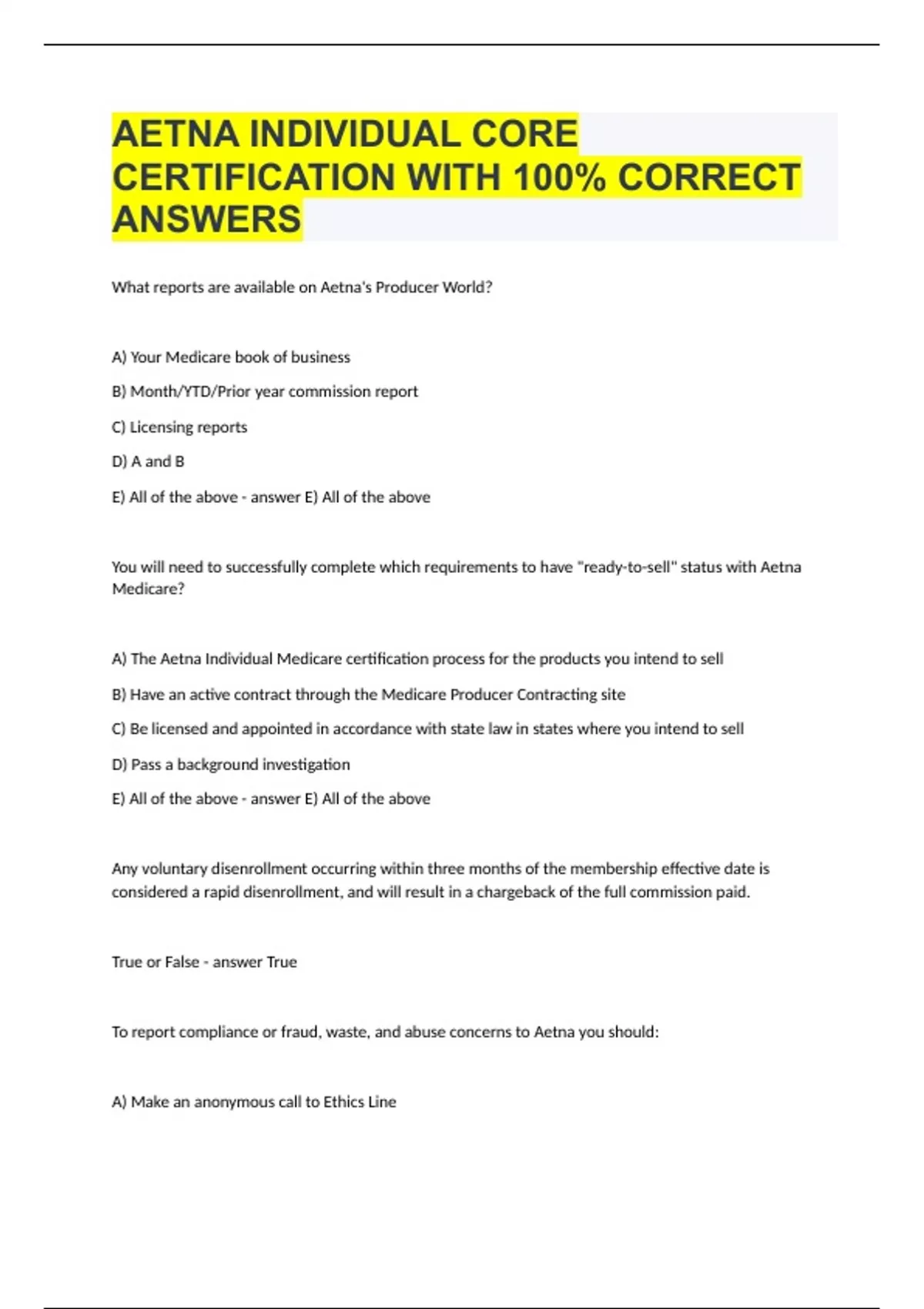 AETNA INDIVIDUAL CORE CERTIFICATION WITH 100% CORRECT ANSWERS.