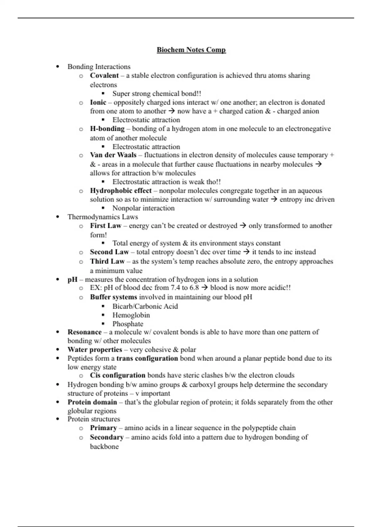This comprehensive compilation of biochemistry notes delves into the fundamental principles of molecular interactions and the architecture of biological systems. Starting with the basics of chemical bonding, it explores the robust covalent bonds forming life's building blocks and the subtler ionic interactions that drive complex biochemical processes. The document examines hydrogen bonding and Van der Waals forces, detailing their role in molecular stability and interactions, while also addressing the hydrophobic effect's contribution to protein folding. A thorough overview of thermodynamic laws provides insight into the energy conservation and entropy considerations central to biochemical reactions. The compilation addresses pH and its critical role in biological systems, including the body's buffer systems that maintain homeostasis. Key structural concepts are outlined, from the primary sequence of amino acids in polypeptide chains to the intricate secondary, tertiary, and quaternary structures of proteins. The notes highlight the importance of protein domains and folding, detailing how specific configurations are crucial for function. With additional focus on the biophysical properties of water, peptide bond formation, and the determinants of protein structure, this document is an invaluable resource for understanding the complex interplay of forces shaping life at the molecular level.