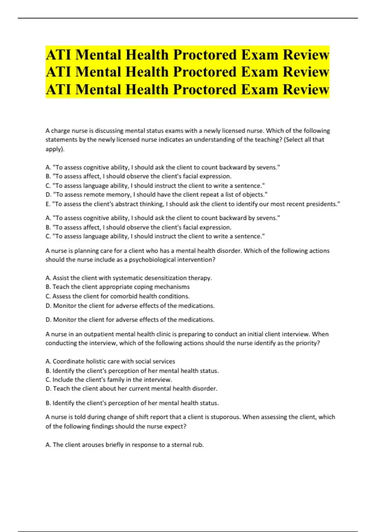 ATI Mental Health Proctored Exam Review A charge nurse is discussing mental status exams with a newly licensed nurse. Which of the following statements by the newly licensed nurse indicates an understanding of the teaching? (Select all that apply). A. "To assess cognitive ability, I should ask the client to count backward by sevens." B. "To assess affect, I should observe the client's facial expression. C. "To assess language ability, I should instruct the client to write a sentence." D. "To assess remote memory, I should have the client repeat a list of objects." E. "To assess the client's abstract thinking, I should ask the client to identify our most recent presidents."