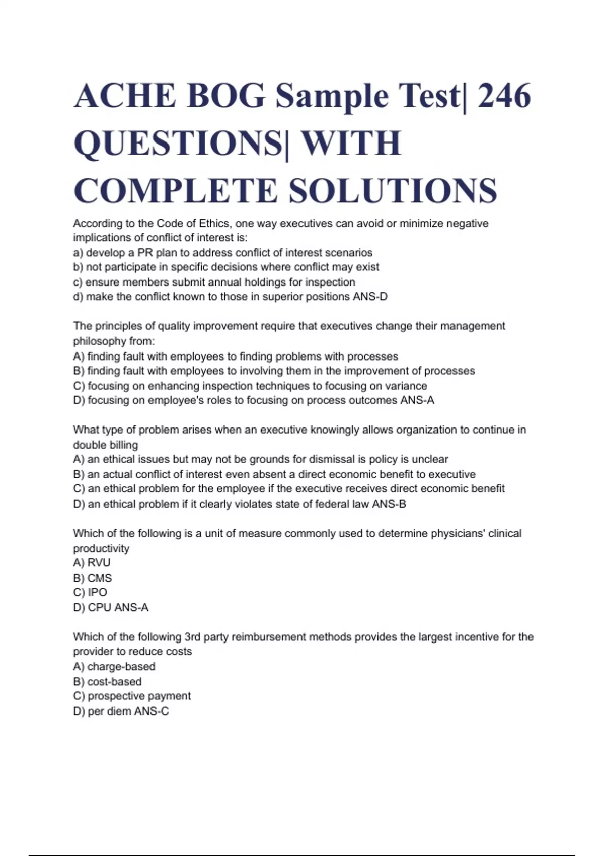 ACHE BOG Sample Test| 246 QUESTIONS| WITH COMPLETE SOLUTIONS According to the Code of Ethics, one way executives can avoid or minimize negative implications of conflict of interest is: a) develop a PR plan to address conflict of interest scenarios b) not participate in specific decisions where conflict may exist c) ensure members submit annual holdings for inspection d) make the conflict known to those in superior positions ANS-D The principles of quality improvement require that executives change their management philosophy from: A) finding fault with employees to finding problems with processes B) finding fault with employees to involving them in the improvement of processes C) focusing on enhancing inspection techniques to focusing on variance D) focusing on employee's roles to focusing on process outcomes ANS-A What type of problem arises when an executive knowingly allows organization to continue in double billing A) an ethical issues but may not be grounds for dismissal is policy is unclear B) an actual conflict of interest even absent a direct economic benefit to executive C) an ethical problem for the employee if the executive receives direct economic benefit D) an ethical problem if it clearly violates state of federal law ANS-B Which of the following is a unit of measure commonly used to determine physicians' clinical productivity A) RVU B) CMS C) IPO D) CPU ANS-A Which of the following 3rd party reimbursement methods provides the largest incentive for the provider to reduce costs A) charge-based B) cost-based C) prospective payment D) per diem ANS-C