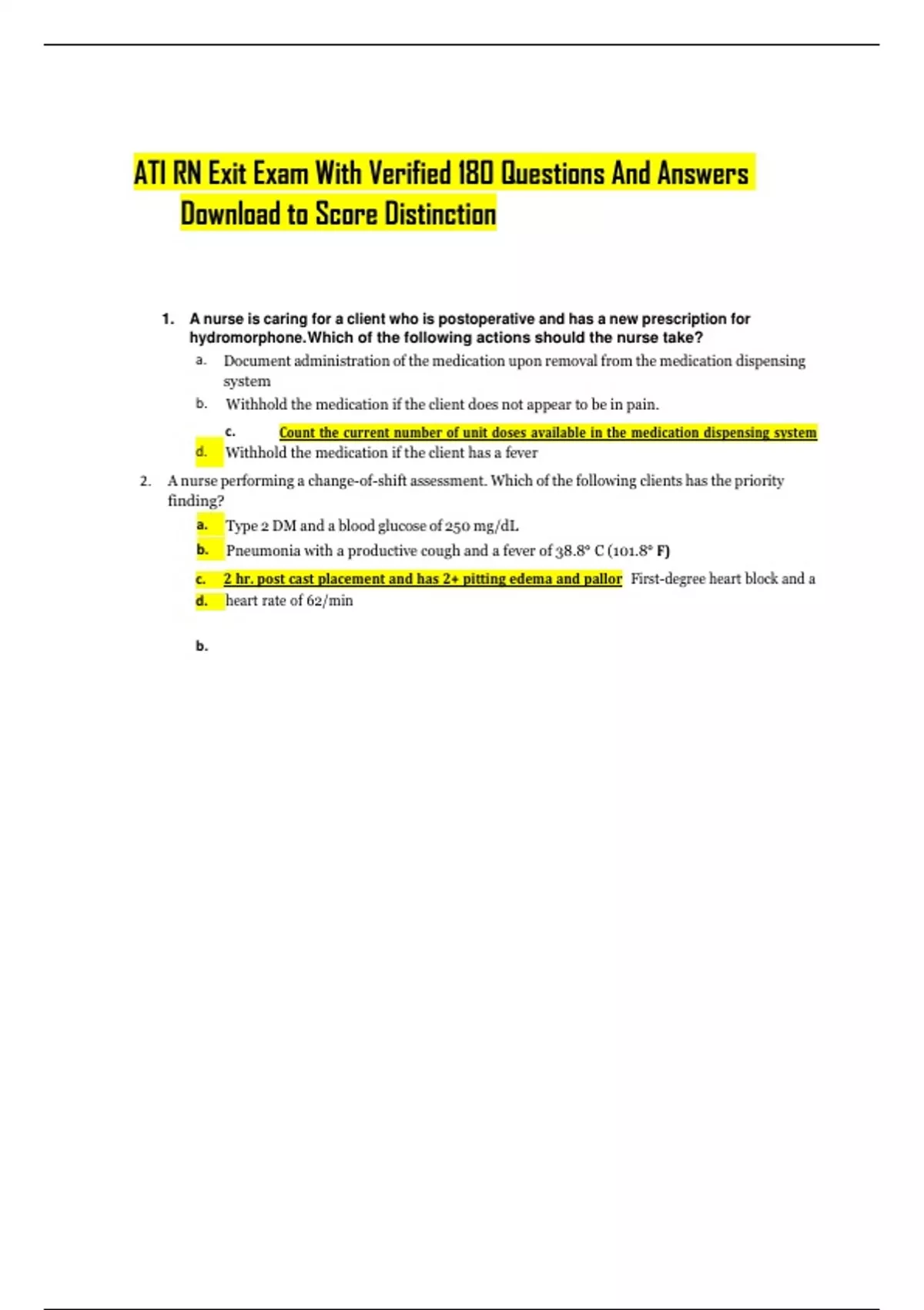 ATI RN Exit Exam With Verified 180 Questions And Answers Download to Score Distinction 1. A nurse is caring for a client who is postoperative and has a new prescription for hydromorphone.Which of the following actions should the nurse take? a. Document administration of the medication upon removal from the medication dispensing system b. Withhold the medication if the client does not appear to be in pain. c. Count the current number of unit doses available in the medication dispensing system d. Withhold the medication if the client has a fever 2. A nurse performing a change-of-shift assessment. Which of the following clients has the priority finding? Type 2 DM and a blood glucose of 250 mg/dL Pneumonia with a productive cough and a fever of 38.8° C (101.8° F) c. 2 hr. post cast placement and has 2+ pitting edema and pallor First-degree heart block and a d. heart rate of 62/min 3. A nurse in an outpatient mental health facility is providing teaching to a group of adolescents. Which of the following statements by a client indicates an understanding of the teaching? a. “I will limit my alcohol use to one drink daily while taking disulfiram.” b. “I will avoid foods containing tyramine while taking fluoexetine.” c. “I will take the sustained-release methylphenidate every morning.” d. “I will take my lithium on an empty stomach.” (pharm pg. 64: taking lithium with food will help decrease GI distress) 4. A nurse in the emergency department is assessing client who has major depressive disorder. Which of the following actions should the nurse take first? [View Exhibit] Administer Zofran to the client for a. nausea Implement seizure precautions for the client c. Encourage the client to verbalize feelings d. Obtain the client’s weight 5. A nurse is completing an admission assessment for a client who ahs narcissistic personality disorder. Which of the following should the nurse expect? a. Suspicious of others b. Exhibits separation anxiety c. Ritualistic behavior d. Preoccupied with aging 6. A nurse is caring for a client who has given informed consent for ECT. Just before the procedure, the client tells the nurse she is considering not going forward with the treatment. Which of the following statements by the nurse is appropriate? a. “You don’t have to go through with the treatment.” “Most people who have this procedure feel better following the treatment.” “It’s okay to be nervous before this treatment.” “Your doctor wouldn’t have ordered this treatment unless it was necessary.” 7. While performing a routine assessment, a nurse notices fraying on the electrical cord of a client’s CPM device. Which of the following actions should the nurse take first? Report the defect to the equipment maintenance staff. Ensure the device inspection sticker is current c. Remove the device from the room d. Initiate a requisition for a replacement CPM device 8. Drug Calc: Client weighs 99 lb. Prescribed diet of 1.5 g protein/kg/day. How many grams of protein per day should the nurse include in the client’s dietary plan? 9. A nurse is planning care for a group of clients and is working with one LPN and one AP. Which of the following actions should the nurse take first to manage her time effectively? a. Develop an hourly time frame for tasks b. Schedule daily activities c. Determine goals of the day d. Delegate tasks to the AP 10. A nurse is developing a plan of care for a client who has preeclampsia and is to receive magnesium sulfate via continuous IV infusion. Which of the following actions should the nurse include in the plan? a. Restrict the client’s total fluid intake to 250 mL/hr. b. Measure the client’s urine output every hour c. Give the client protamine if signs of magnesium sulfate toxicity occur (antidote: calcium gluconate) d. Monitor the FHR via Doppler every 30 min 11. A nurse is caring for a group of clients. Which of the following wounds should the nurse expect to heal by primary intention? a. Infected laceration c. b. Stage II pressure ulcer c. Approximated surgical incision d. Partial-thickness burn 12. A nurse in an acute mental health care facility is prioritizing care for multiple clients. Which of the following clients should the nurse see first? a. Client taking clozapine to treat schizophrenia and reports sore throat (pharm pg. 72: monitor for infection [fever, sore throat, etc.]) b. Client has OCD and is upset about a change in daily routine c. Client has narcissistic personality disorder and is mocking others during group therapy d. Client who has depressive disorder and requires assistance with ADLs 13. A nurse is caring for a client who has an implanted venous access port. Which of the following should the nurse use to assess the port? a. An angiocatheter b. A butterfly needle c. A noncoring needle d. A 25 gauge needle 14. A nurse is caring for a client who has pneumonia and tells the nurse, “I feel like an elephant is sitting on my chest.” The client is weak and unable to walk. After the nurse indicates chest pain protocol, which of the following is the priority diagnostic test? a. PT and INR b. 12 lead ECG Chest X-ray d. Serum potassium 15. A nurse is assessing the growth and development of a 3 y/o child. Which of the following questions should the nurse ask the parent to determine if the child is exhibiting typical developmental expectations? a. “Can your child draw a stick figure?” b. “Can your child catch and throw a small ball?” c. “Can your child ride a tricycle?” d. “Can your child name five colors?” 16. A nurse is preparing to assess fetal heart tones for a client who is at 12 weeks of gestation. Which of the following actions should the nurse take? a. Measure the fundal height to determine the placement of the ultrasound stethoscope b. Perform Leopold maneuvers prior to auscultating the FHR c. Position the ultrasound stethoscope above the symphysis pubis to assess the FHR d. Place the client in a side-lying posi