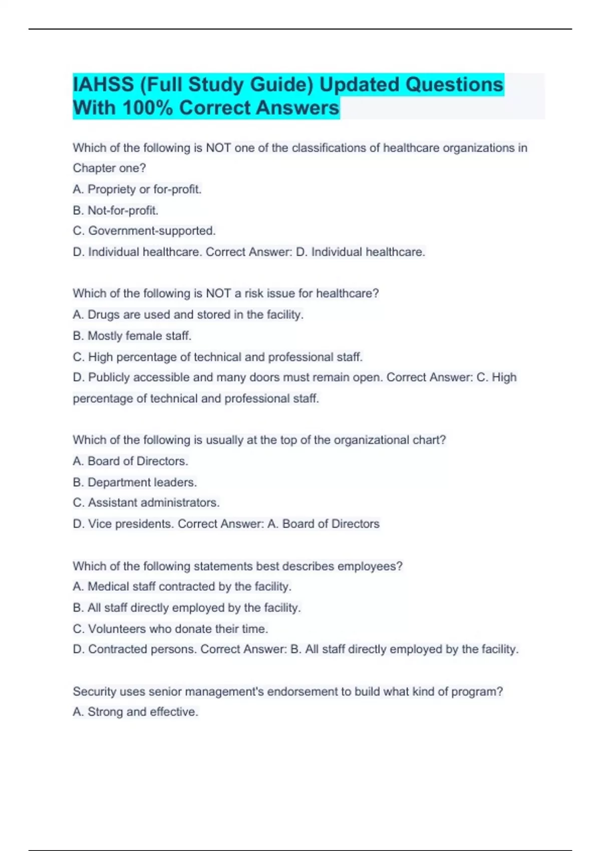 IAHSS (Full Study Guide) Updated Questions With 100% Correct Answers Which of the following is NOT one of the classifications of healthcare organizations in Chapter one? A. Propriety or for-profit. B. Not-for-profit. C. Government-supported. D. Individual healthcare. Correct Answer: D. Individual healthcare. Which of the following is NOT a risk issue for healthcare? A. Drugs are used and stored in the facility. B. Mostly female staff. C. High percentage of technical and professional staff. D. Publicly accessible and many doors must remain open. Correct Answer: C. High percentage of technical and professional staff. Which of the following is usually at the top of the organizational chart? A. Board of Directors. B. Department leaders. C. Assistant administrators. D. Vice presidents. Correct Answer: A. Board of Directors Which of the following statements best describes employees? A. Medical staff contracted by the facility. B. All staff directly employed by the facility. C. Volunteers who donate their time. D. Contracted persons. Correct Answer: B. All staff directly employed by the facility. Security uses senior management's endorsement to build what kind of program? A. Strong and effective. B. A program that works in a small part of the facility. C. Generally effective. D. Strong and simple. Correct Answer: A. Strong and effective. How should friendships and inter-personal relationships between security officers and staff members from other departments be treated? A. Discouraged. B. Encouraged. C. Encouraged but monitored. D. Encouraged, but security staff educated about ethics and avoiding favoritism. Correct Answer: D. Encouraged, but security staff educated about ethics and avoiding favoritism. Which of the following allows a department to assess its cost-effectiveness within an organization? A. Crime analysis. B. Risk assessments. C. Bench-marking. D. Evaluation surveys. Correct Answer: C. Bench-marking. What should the most primary overriding concern of any security department be? A. Its image. B. The safety and well-being of anyone in the facility. C. The goals and mission of the entity employing the security services. D. Cost-effectiveness. Correct Answer: B. The safety and well-being of anyone in the facility. Which of the following are skills a security professional should have and use at all times? A. Good observation skills. B. good communication skills. C. Tolerance. D. All of the above. Correct Answer: D. All of the above. Why are vendors potentially a high security risk to a healthcare facility? A. Vendors often have access to sensitive areas yet staff of the healthcare organization may know very little about vendor's background. B. Vendors typically drive large vehicles that can conceal large amounts of stolen