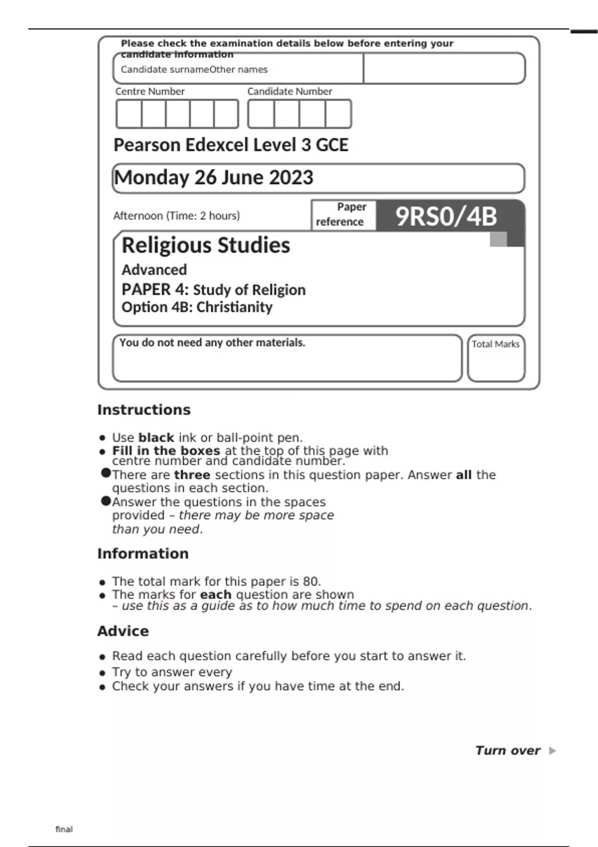 Edexcel Religious Studies 9RS0/4B Question Paper June2023.