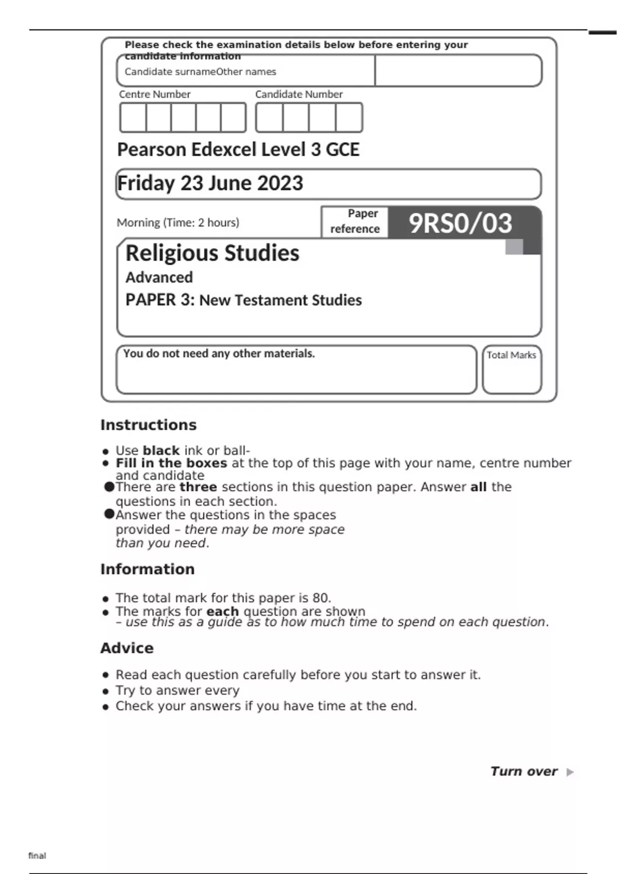 Edexcel Religious Studies 9RS0-03 Question Paper June2023.