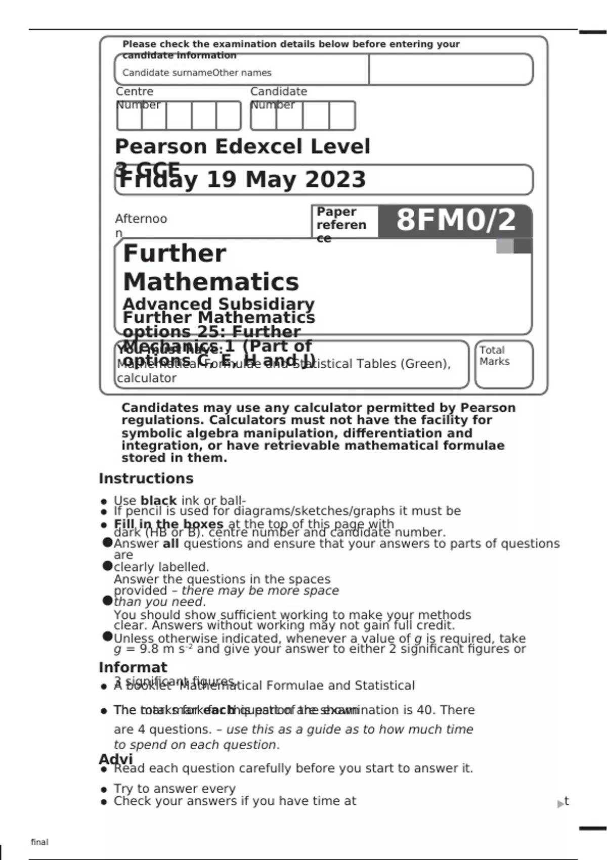 Edexcel Further Mathematics 8FM0-25 Question Paper May2023.