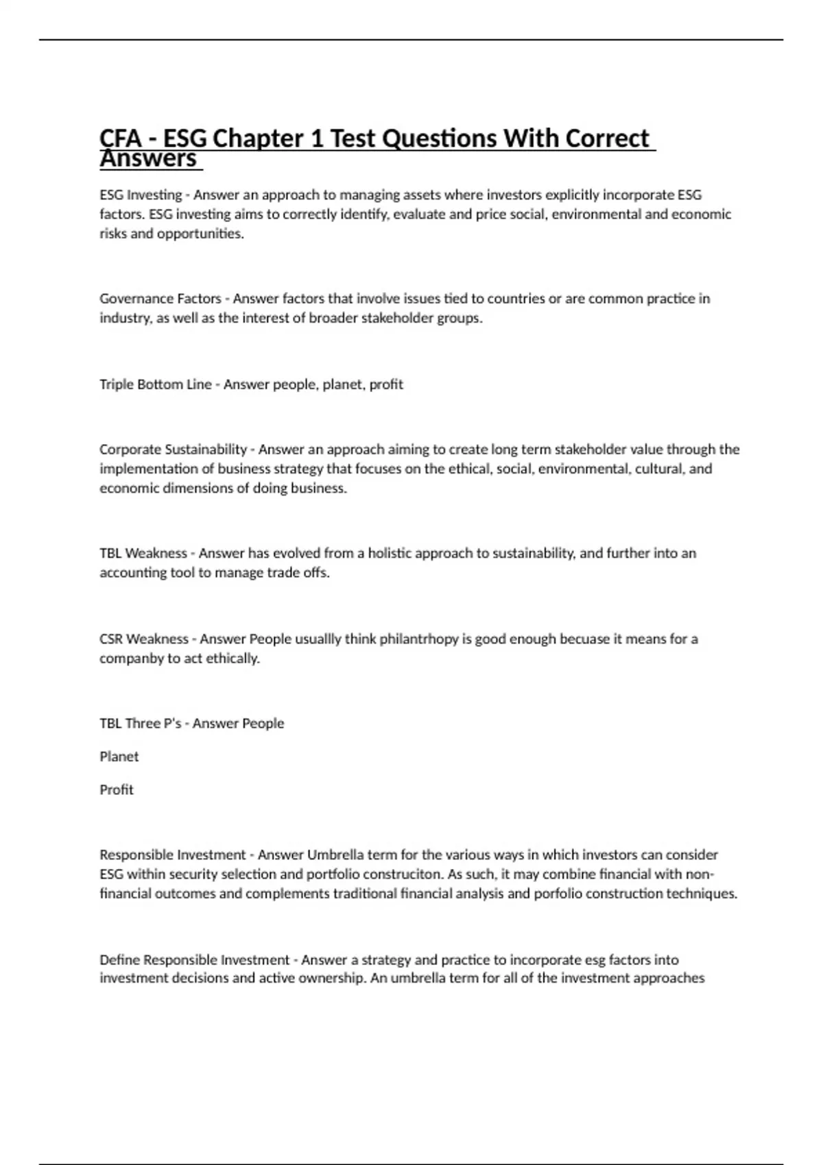 Responsible Investment - Answer Umbrella term for the various ways in which investors can consider ESG within security selection and portfolio construciton. As such, it may combine financial with non-