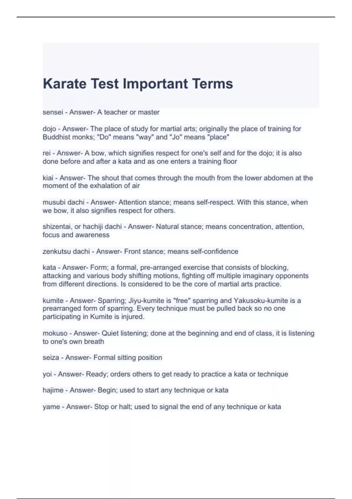 Karate Test Important Terms Questions and Answers Graded A