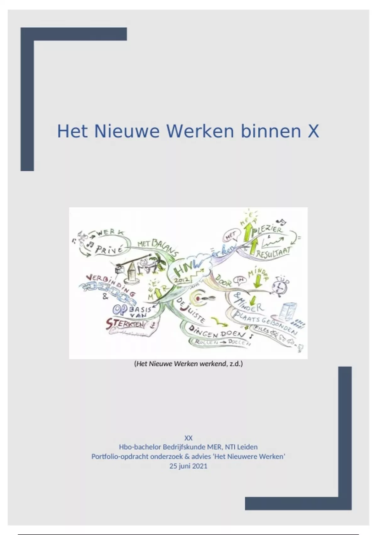 In maart 2020 brak het coronavirus uit, wat ervoor zorgde dat Het Nieuwe Werken in een hoog tempo is ingevoerd binnen X. Hieruit konden de werknemers zelf hun werktijden bepalen. Daarbij werd er voornamelijk vanuit huis gewerkt. Vanuit een klein onderzoek bij de medewerkers kwam naar voren dat 65% van de medewerkers liever niet meer vanuit huis wilt werken en ook geen flexibiliteit wil rondom de werktijden. De overige 40% van de werknemers is wel tevreden met de flexibiliteit en het indelen van hun eigen werktijden. Hieruit is een probleemdefinitie voortgevloeid en een vragenlijst opgesteld (hoofdstuk 1). Vervolgens is er literatuuronderzoek gedaan naar Het Nieuwe Werken, arbeidstevredenheid, de risico’s van Het Nieuwe Werken en de relatie tussen Het Nieuwe Werken en arbeidstevredenheid. Vanuit het onderzoek zijn de eerste vier deelvragen beantwoord (hoofdstuk 2). Na het literatuuronderzoek is de methode(n) van onderzoek in kaart gebracht. Hierbij wordt de methodologie, validiteit en betrouwbaarheid van het onderzoek besproken (hoofdstuk 3). Hierna is de vragenlijst bij de respondenten afgenomen en zijn de resultaten geanalyseerd en beschreven (hoofdstuk 4). Vervolgens is in de conclusie de empirische deelvragen beantwoord en wordt in de discussie de sterke en zwakke kanten van het onderzoek besproken (hoofdstuk 5). In hoofdstuk 6 zijn er drie manieren naar voren gekomen om de gewenste doelstelling van X te realiseren. Hierbij zijn de voor- en nadelen van de alternatieven besproken en is er een advies gegeven. Nadat er een oplossingsalternatief is gekozen (hoofdstuk 7) wordt deze doormiddel van een implementatieplan ingevoerd. Hierin is het communicatieplan en beheersplan (kosten en baten) opgenomen. Ook is er een risicoanalyse gemaakt. Als laatste wordt er, door middel van de STARR-methode, gereflecteerd op dit onderzoek (hoofdstuk 8).