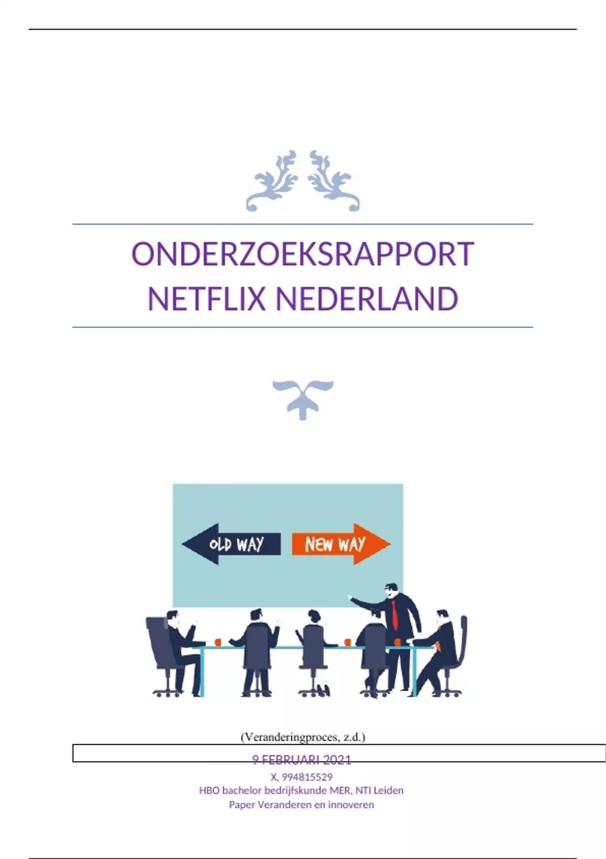Voor de paper ‘veranderen en innoveren’ wordt er een onderzoeksrapport opgesteld voor Netflix Nederland. Netflix is een streamingsdienst waarmee je onbeperkt films en series kunt kijken op je tablet, smartphone, TV of PC. Daarbij kan de gebruiker zelf bepalen wat en wanneer er gekeken wordt (ook wel video on demand genoemd). Het streamingsplatform maakt gebruik van hoge kwaliteit en er is een groot aanbod aan Full HD films. De klant kan kiezen uit drie pakketten. Het eerste pakket is het goedkoopst. De klant kan op één scherm kijken zonder HD. Het tweede pakket is het meest gekozen pakket bij Netflix. De klant kan op twee schermen tegelijk kijken met HD. Het derde premium pakket kan de klant kijken op vier schermen tegelijk met HD en Ultra HD (Wat is Netflix? | Het complete aanbod op N, z.d.). Netflix is actief in de branches distributie van films, televisieproducties en overige zakelijke dienstverlening (- Online bedrijvengids, z.d.). Netlix staat bekend als het bedrijf met een verbluffende cultuur en de nieuwste innovaties. Hierdoor is mijn interesse gewekt en wil ik het bedrijf onderzoeken. Om de opdracht vorm te geven ga ik in gesprek met drie sleutelfiguren binnen Netflix, namelijk Vice President M. de Cock, E. Brizzel (accountant) en A. Jacobsen (HR-manage). Het doel van het onderzoeksrapport is de relatie tussen innoveren en veranderen. Innoveren kan tot verandering leiden, maar niet elke verandering hoeft te leiden tot innovatie. Als eerste dient er een externe analyse gemaakt te worden, waarin de omgeving- en marktanalyse in kaart worden gebracht. Vervolgens worden de twee belangrijkste kansen en bedreigingen besproken. Eén van de sterktes is dat de markt open staat voor innovaties (hoofdstuk 1). Na de externe analyse wordt er een interne analyse gemaakt. Deze bestaat uit een integrale en partiële organisatiediagnose. Ook hier worden de twee belangrijkste sterktes en zwaktes besproken. Hier is naar voren gekomen dat 49% van alle beoordelingen negatief zijn door technische problemen op het streamingsplatform (hoofdstuk 2). Vervolgens wordt de gewenste situatie in kaart gebracht door middel van interviews met sleutelfiguren binnen de organisatie. Hierin wordt ook besproken hoe de nieuwe innovatie en sociale-innovatie het probleem van Netflix kunnen verhelpen (hoofdstuk 3). Nadat alle stappen zijn doorlopen dient het advies aan Netflix te worden gegeven. Door middel van de ‘veranderkwadranten van Berenschot’ krijgen de veranderstrategie en veranderaanpak vorm. De interventies krijgen vorm doordat de kleuren van de Caluwé zijn toegepast.