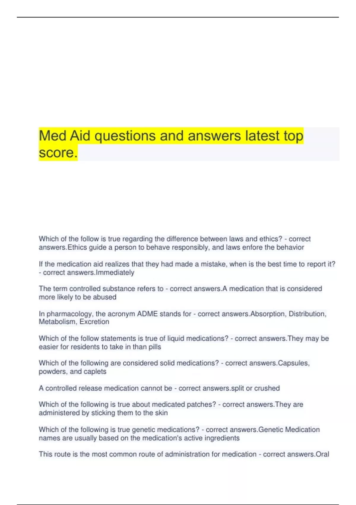 Med Aid questions and answers latest top score. Which of the follow is true regarding the difference between laws and ethics? - correct answers.Ethics guide a person to behave responsibly, and laws enfore the behavior If the medication aid realizes that they had made a mistake, when is the best time to report it? - correct answers.Immediately The term controlled substance refers to - correct answers.A medication that is considered more likely to be abused In pharmacology, the acronym ADME stands for - correct answers.Absorption, Distribution, Metabolism, Excretion Which of the follow statements is true of liquid medications? - correct answers.They may be easier for residents to take in than pills Which of the following are considered solid medications? - correct answers.Capsules, powders, and caplets A controlled release medication cannot be - correct or crushed Which of the following is true about medicated patches? - correct answers.They are administered by sticking them to the skin Which of the following is true genetic medications? - correct answers.Genetic Medication names are usually based on the medication's active ingredients This route is the most common route of administration for medication - correct answers.Oral
