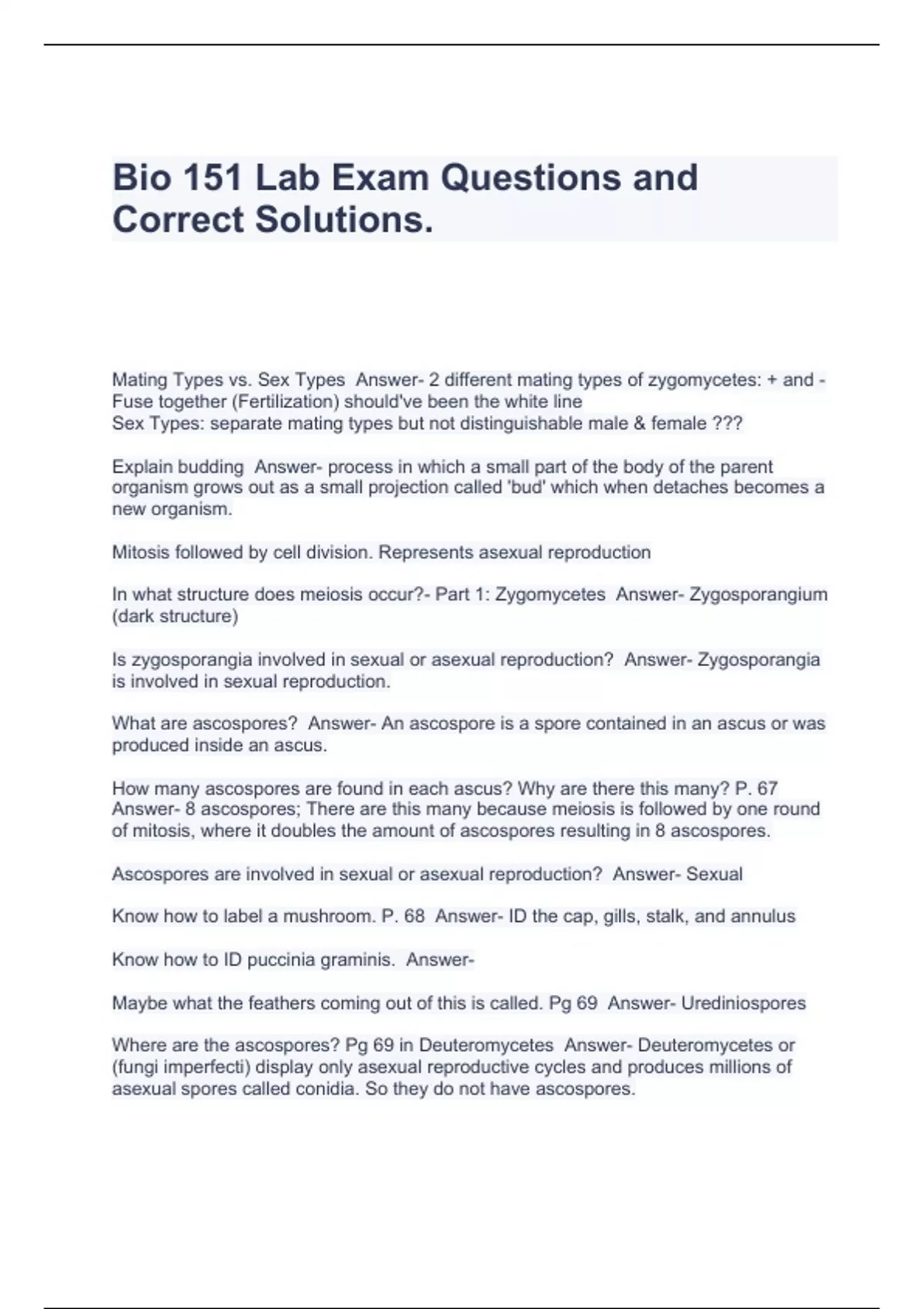 Bio 151 Lab Exam Questions and Correct Solutions.