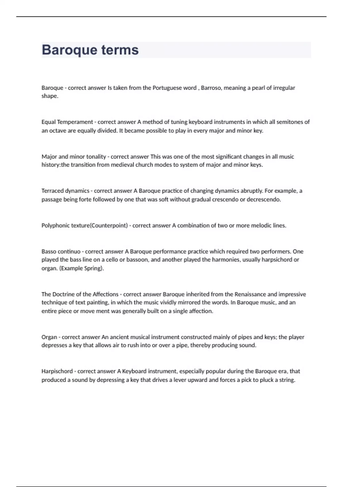 Baroque terms Baroque - correct answer Is taken from the Portuguese word , Barroso, meaning a pearl of irregular shape. Equal Temperament - correct answer A method of tuning keyboard instruments in which all semitones of an octave are equally divided. It became possible to play in every major and minor key. Major and minor tonality - correct answer This was one of the most significant changes in all music history:the transition from medieval church modes to system of major and minor keys. Terraced dynamics - correct answer A Baroque practice of changing dynamics abruptly. For example, a passage being forte followed by one that was soft without gradual crescendo or decrescendo. Polyphonic texture(Counterpoint) - correct answer A combination of two or more melodic lines. Basso continuo - correct answer A Baroque performance practice which required two performers. One played the bass line on a cello or bassoon, and another played the harmonies, usually harpsichord or organ. (Example Spring). The Doctrine of the Affections - correct answer Baroque inherited from the Renaissance and impressive technique of text painting, in which the music vividly mirrored the words. In Baroque music, and an entire piece or move ment was generally built on a single affection. Organ - correct answer An ancient musical instrument constructed mainly of pipes and keys; the player depresses a key that allows air to rush into or over a pipe, thereby producing sound. Harpischord - correct answer A Keyboard instrument, especially popular during the Baroque era, that produced a sound by depressing a key that drives a lever upward and forces a pick to pluck a string. Clavichord - correct answer Stringed keyboard instrument popular in the Renaissance and Baroque that is capable of unique expressive devices not possible on the harpsichord. The rise of instrumental music - correct answer Composers of the early Baroque period were the first to think of instrumental music as important as vocal music. Composers began to assign specific instruments to specific musical lines. Three important keyboard instruments of the Baroque Era were - correct answer The organ, Harpsichord, and Clavichord. Genre - correct answer The term used to classify music into distinct categories, such as opera, symphony, a piano piece,etc. Homophonic texture - correct answer Texture with a single melody and harmonic accompaniment. Figure Bass - correct answer A bass part provided with numerals to indicate the harmonies to be played. Solo concerto - correct answer An instrumental genre generally in three movements for solo instrument and orchestra. It is frequently employed in ritornello form. Ripieno - correct answer The full orchestral ensemble in a Baroque Concerto. Ritornello form - correct answer A structure used in the first and third movements of the Baroque concerto. The short recurring passage, called ritornello is re-stated throughout the movement. Drone - correct answer Sustaining sound of one or several tones for harmonic support, a common feature of some folk music. Ositnato - correct answer A short melodic, or rhythmic pattern that is repeated throughout a work. Prelude - correct answer A short keyboard composition which is often followed by a fugue.