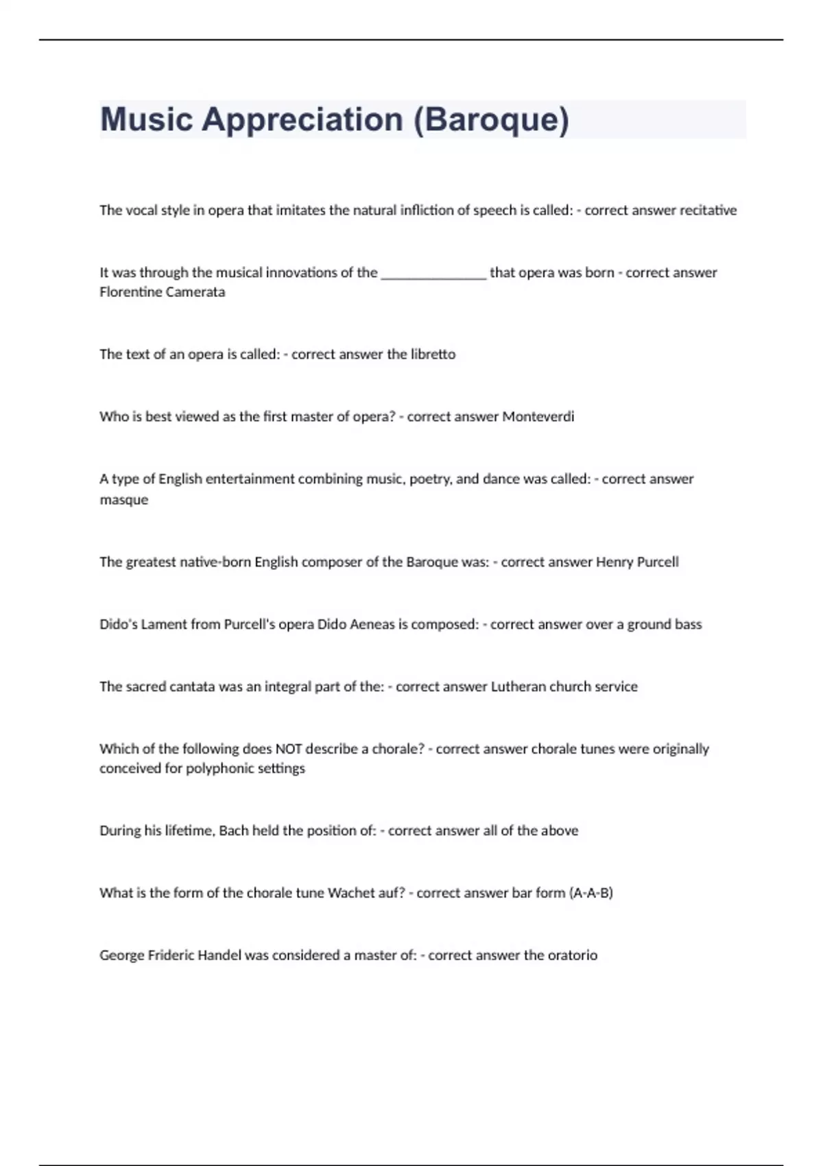 Music Appreciation (Baroque) The vocal style in opera that imitates the natural infliction of speech is called: - correct answer recitative It was through the musical innovations of the ______________ that opera was born - correct answer Florentine Camerata The text of an opera is called: - correct answer the libretto Who is best viewed as the first master of opera? - correct answer Monteverdi A type of English entertainment combining music, poetry, and dance was called: - correct answer masque The greatest native-born English composer of the Baroque was: - correct answer Henry Purcell Dido's Lament from Purcell's opera Dido Aeneas is composed: - correct answer over a ground bass The sacred cantata was an integral part of the: - correct answer Lutheran church service Which of the following does NOT describe a chorale? - correct answer chorale tunes were originally conceived for polyphonic settings During his lifetime, Bach held the position of: - correct answer all of the above What is the form of the chorale tune Wachet auf? - correct answer bar form (A-A-B) George Frideric Handel was considered a master of: - correct answer the oratorio When Handel arrived in London, he established his fame by composing: - correct answer operas Late in life, Handel turned his efforts from the opera to: - correct answer the oratorio Which of the following is Handel's most famous oratorio, frequently performed today? - correct answer Messiah Why is Messiah so popular in England and America today? - correct answer all of the above "Rejoice greatly, O daughter of Zion" from Messiah is an example of: - correct answer a da capo aria The famous choral climax in Part II of Handel's Messiah is: - correct answer the "Hallelujah Chorus" Of the following, which is NOT a major difference between Baroque and modern violins? - correct answer the general shape of the instrument Which of the following dance types was NOT standard in a Baroque suite? - correct answer tarantella A gigue is best described as: - correct answer a lively sextuple-meter dance What is the form of each individual movement is a suite? - correct answer binary The concept of the suite was applied to: - correct answer all of the above The form of the rondeau is: - correct answer A-B-A-C-A The approximate dates of the Baroque period are: - correct answer John Milton's Paradise Lost is an epic poem expressing the views of: - correct answer Protestants