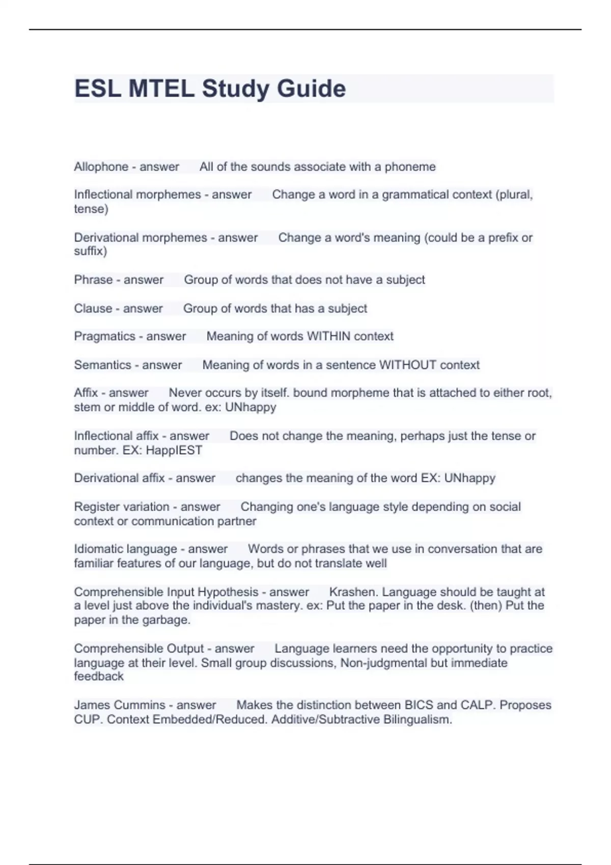 ESL MTEL Study Guide Questions and Answers