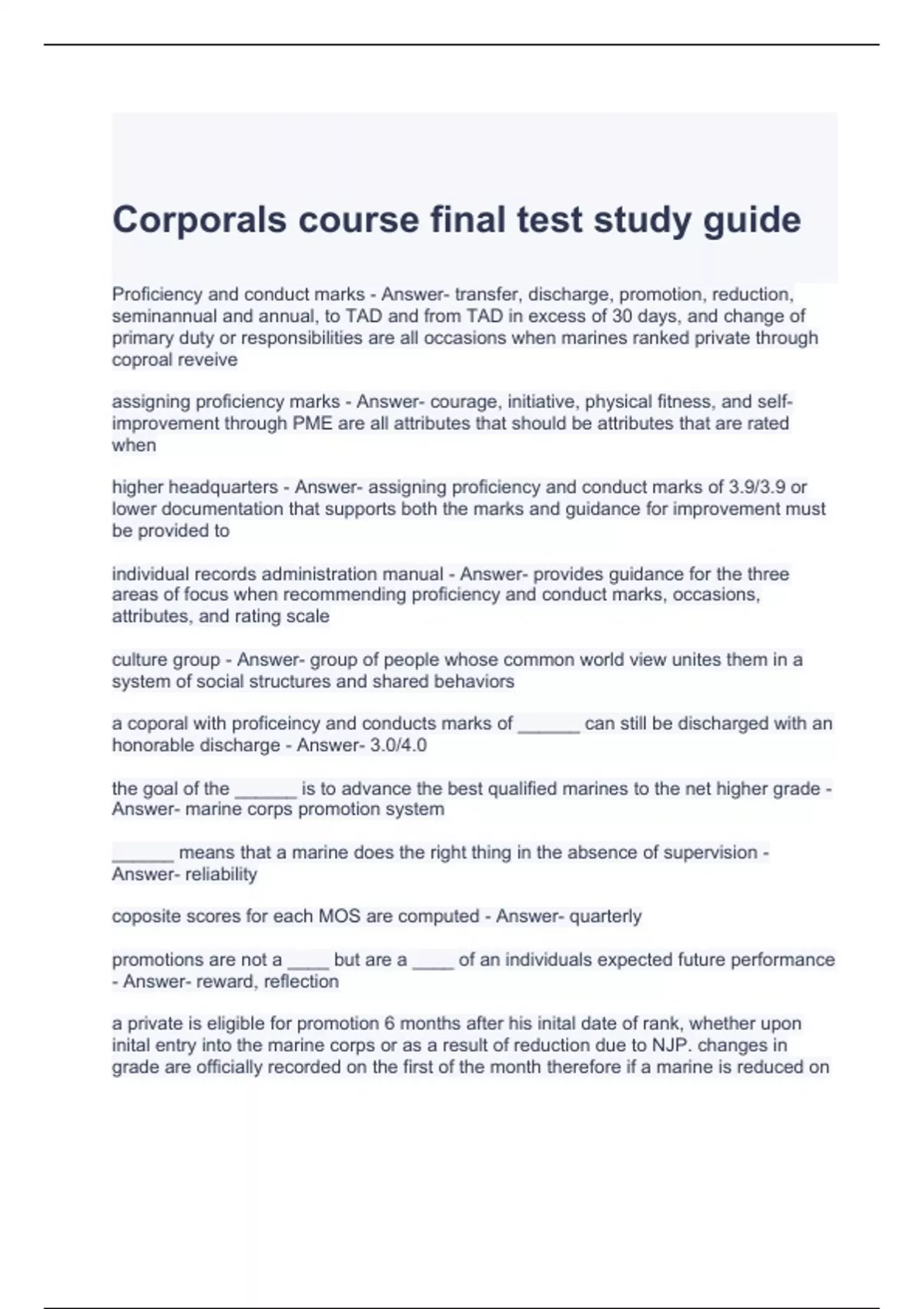 Corporals course final test study guide with complete solutions