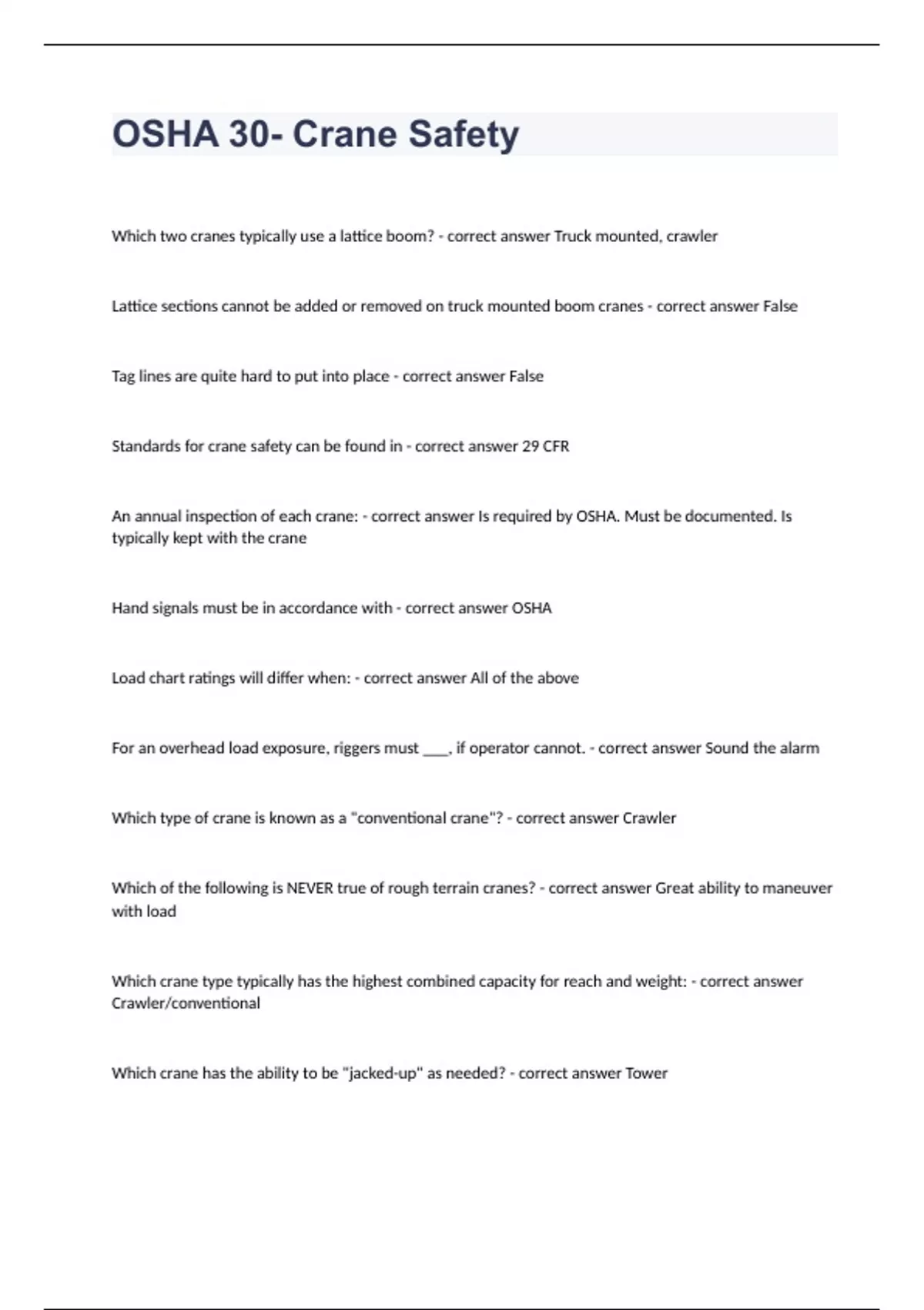 OSHA 30- Crane Safety Question and answers correctly solved 2023/2024Which two cranes typically use a lattice boom? - correct answer Truck mounted, crawler Lattice sections cannot be added or removed on truck mounted boom cranes - correct answer False Tag lines are quite hard to put into place - correct answer False Standards for crane safety can be found in - correct answer 29 CFR An annual inspection of each crane: - correct answer Is required by OSHA. Must be documented. Is typically kept with the crane Hand signals must be in accordance with - correct answer OSHA Load chart ratings will differ when: - correct answer All of the above For an overhead load
