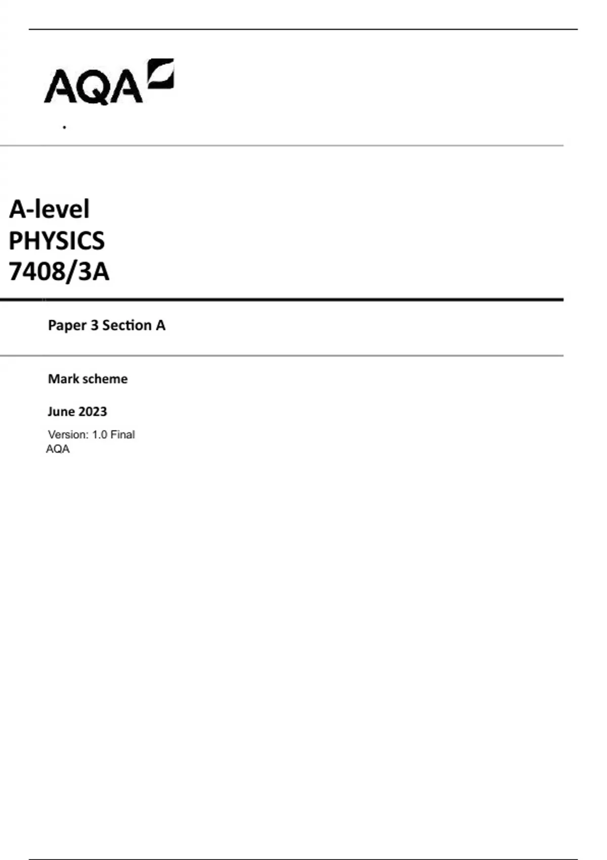 AQA A-level PHYSICS 7408/3A Paper 3 Section A Mark scheme June 2023 Version: 1.0 Final