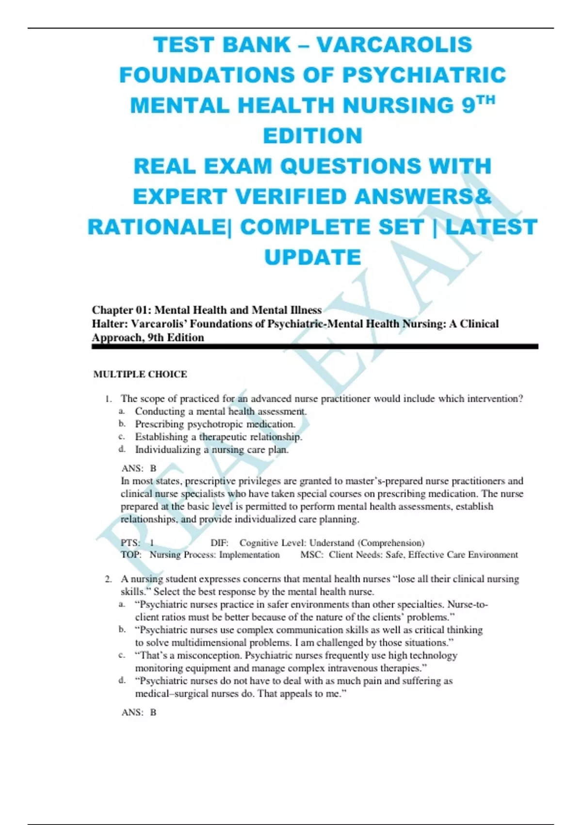 TEST BANK – VARCAROLIS FOUNDATIONS OF PSYCHIATRIC MENTAL HEALTH NURSING 9TH EDITION REAL EXAM QUESTIONS WITH EXPERT VERIFIED ANSWERS& RATIONALE| COMPLETE SET | LATEST UPDATE Chapter 01: Mental Health and Mental Illness Halter: Varcarolis’ Foundations of Psychiatric-Mental Health Nursing: A Clinical Approach, 9th Edition MULTIPLE CHOICE 1. The scope of practiced for an advanced nurse practitioner would include which intervention? a. Conducting a mental health assessment. b. Prescribing psychotropic medication. c. Establishing a therapeutic relationship. d. Individualizing a nursing care plan. ANS: B In most states, prescriptive privileges are granted to master’s-prepared nurse practitioners and clinical nurse specialists who have taken special courses on prescribing medication. The nurse prepared at the basic level is permitted to perform mental health assessments, establish relationships, and provide individualized care planning. PTS: 1 DIF: Cognitive Level: Understand (Comprehension) TOP: Nursing Process: Implementation MSC: Client Needs: Safe, Effective Care Environment 2. A nursing student expresses concerns that mental health nurses “lose all their clinical nursing skills.” Select the best response by the mental health nurse. a. “Psychiatric nurses practice in safer environments than other specialties. Nurse-toclient ratios must be better because of the nature of the clients’ problems.” b. “Psychiatric nurses use complex communication skills as well as critical thinking to solve multidimensional problems. I am challenged by those situations.” c. “That’s a misconception. Psychiatric nurses frequently use high technology monitoring equipment and manage complex intravenous therapies.” d. “Psychiatric nurses do not have to deal with as much pain and suffering as medical–surgical nurses do. That appeals to me.” ANS: B The practice of psychiatric nursing requires a different set of skills than medical–surgical nursing, though there is substantial overlap. Psychiatric nurses must be able to help clients with medical as well as mental health problems, reflecting the holistic perspective these nurses must have. Nurse–client ratios and workloads in psychiatric settings have increased, just like other specialties. Psychiatric nursing involves clinical practice, not just documentation. Psychosocial pain and suffering are as real as physical pain and suffering. PTS: 1 DIF: Cognitive Level: Apply (Application) TOP: Nursing Process: Implementation MSC: Client Needs: Safe, Effective Care Environment 3. When a new bill introduced in Congress reduces funding for care of persons diagnosed with mental illness, a group of nurses write letters to their elected representatives in opposition to the legislation. Which role have the nurses fulfilled? a. Recovery b. Attending c. Advocacy d. Evidence-based practice ANS: C An advocate defends or asserts another’s cause, particularly when the other person lacks the ability to do that for self. Examples of individual advocacy include helping clients understand their rights or make decisions. On a community scale, advocacy includes political activity, public speaking, and publication in the interest of improving the human condition. Since funding is necessary to deliver quality programming for persons with mental illness, the letterwriting campaign advocates for that cause on behalf of clients who are unable to articulate their own needs. PTS: 1 DIF: Cognitive Level: Understand (Comprehension) TOP: Nursing Process: Evaluation MSC: Client Needs: Safe, Effective Care Environment