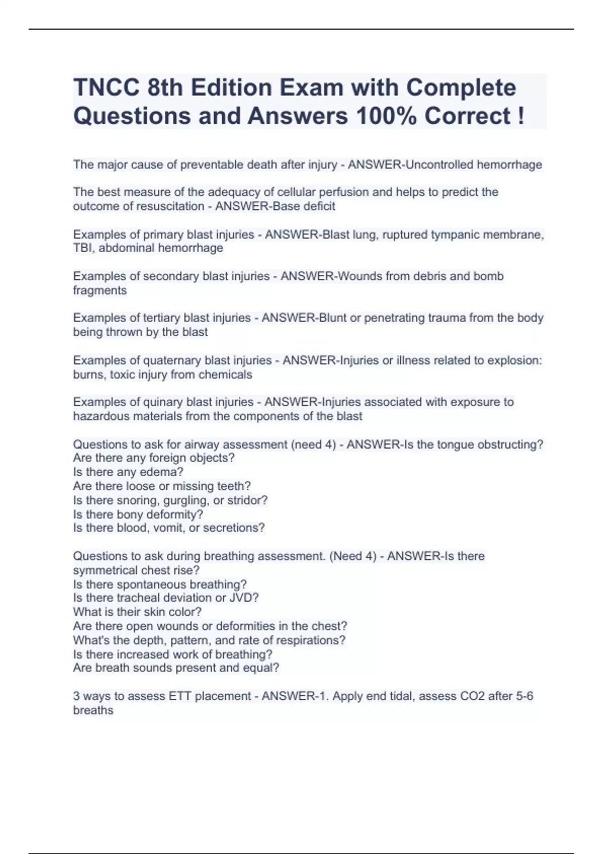 TNCC 8th Edition Exam with Complete Questions and Answers 100% Correct ! The major cause of preventable death after injury - ANSWER-Uncontrolled hemorrhage The best measure of the adequacy of cellular perfusion and helps to predict the outcome of resuscitation - ANSWER-Base deficit Examples of primary blast injuries - ANSWER-Blast lung, ruptured tympanic membrane, TBI, abdominal hemorrhage Examples of secondary blast injuries - ANSWER-Wounds from debris and bomb fragments Examples of tertiary blast injuries - ANSWER-Blunt or penetrating trauma from the body being thrown by the blast Examples of quaternary blast injuries - ANSWER-Injuries or illness related to explosion: burns, toxic injury from chemicals Examples of quinary blast injuries - ANSWER-Injuries associated with exposure to hazardous materials from the components of the blast