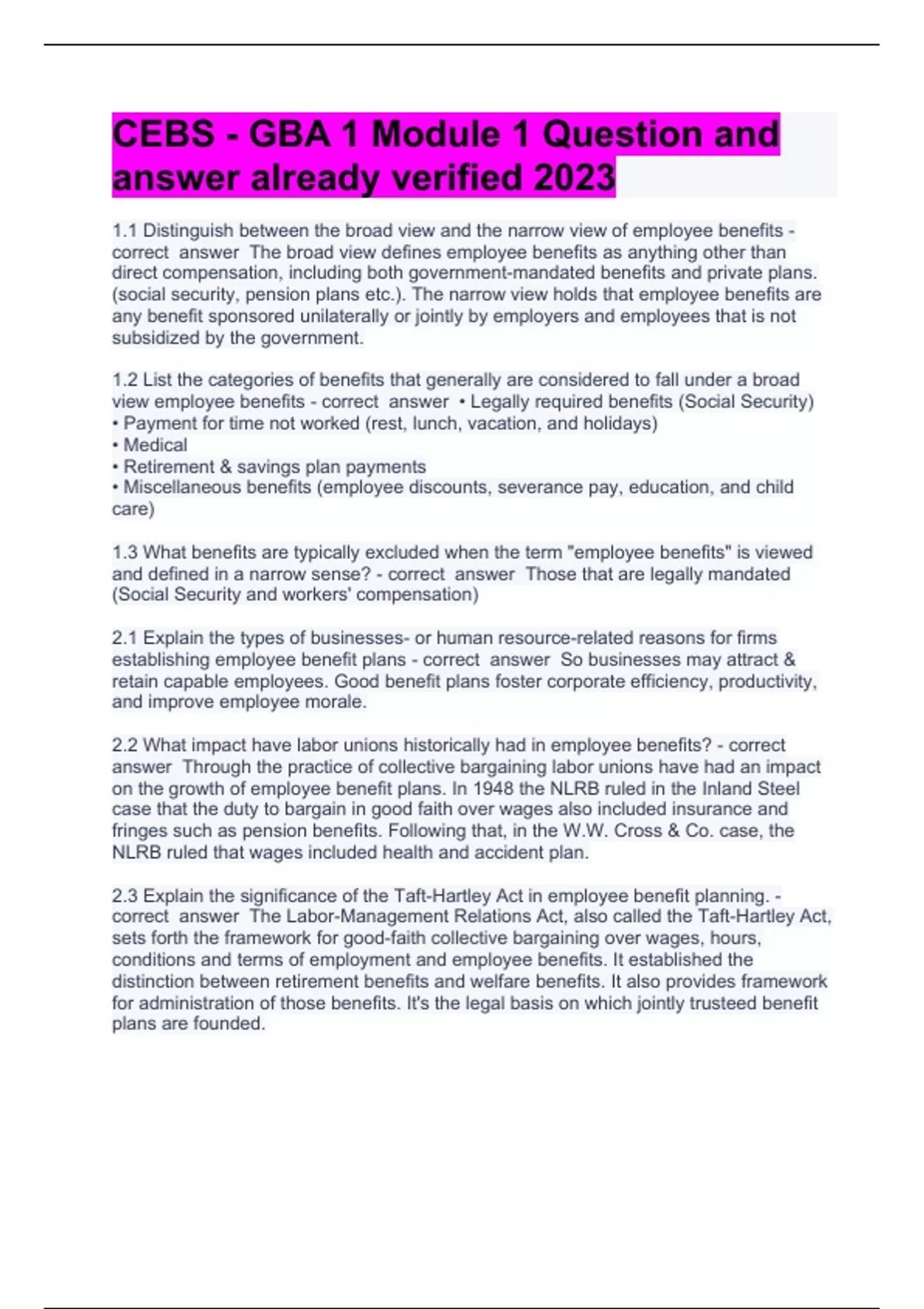 CEBS2 Question and answers rated A+ 2023/20241.1 Distinguish between the broad view and the narrow view of employee benefits - correct answer The broad view defines employee benefits as anything other than direct compensation, including both government-mandated benefits and private plans. (social security, pension plans etc.). The narrow view holds that employee benefits are any benefit sponsored unilaterally or jointly by employers and employees that is not subsidized by the government. 1.2 List the categories of benefits that generally are considered to fall under a broad view employee benefits - correct answer • Legally required benefits (Social Security) • Payment for time not worked (rest, lunch, vacation, and holidays) • Medical • Retirement & savings plan payments • Miscellaneous benefits (employee discounts, severance pay, education, and child care)