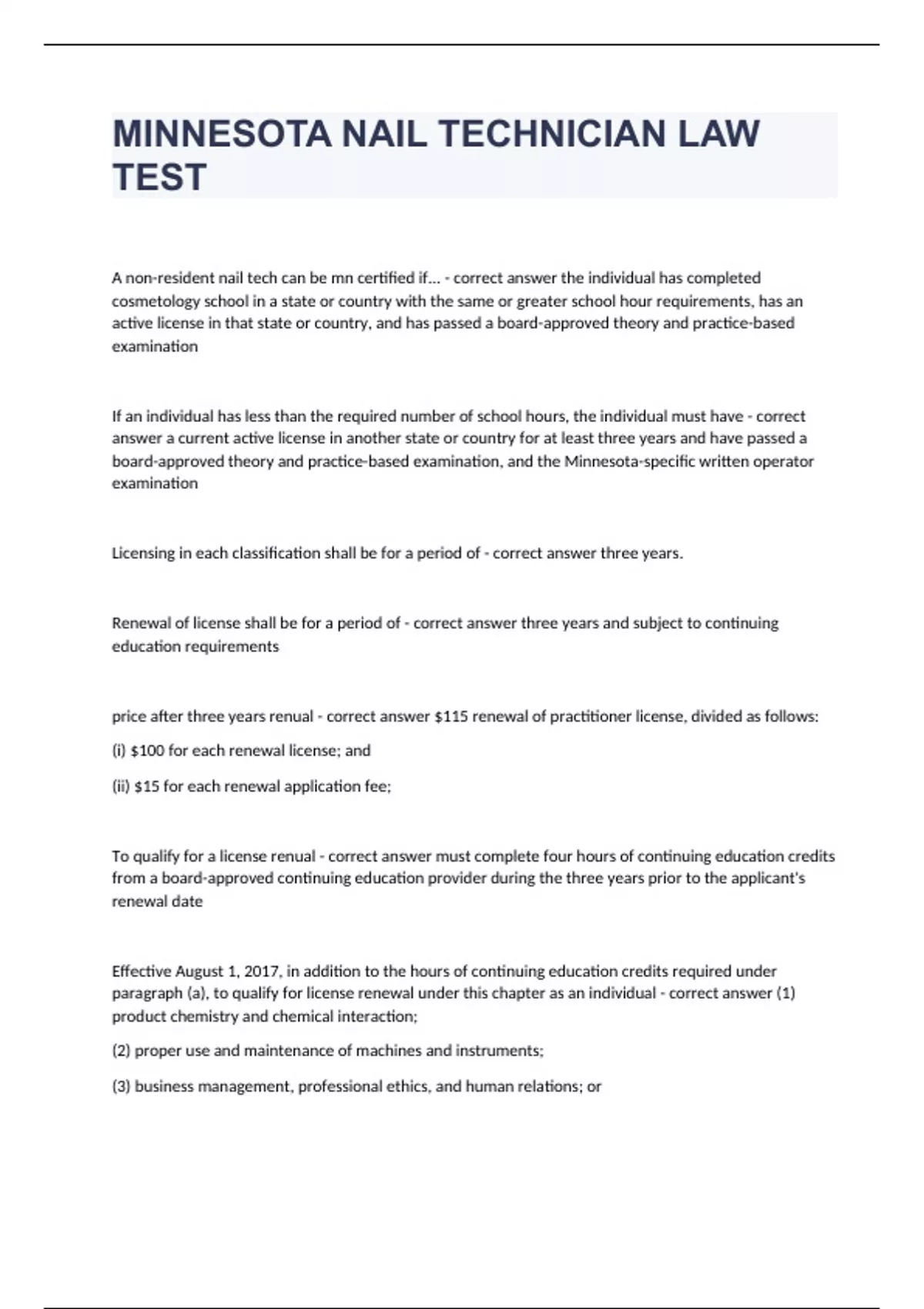 MINNESOTA NAIL TECHNICIAN LAW TESTA non-resident nail tech can be mn certified if... - correct answer the individual has completed cosmetology school in a state or country with the same or greater school hour requirements, has an active license in that state or country, and has passed a board-approved theory and practice-based examination If an individual has less than the required number of school hours, the individual must have - correct answer a current active license in another state or country for at least three years and have passed a board-approved theory and practice-based examination, and the Minnesota-specific written operator examination Licensing in each classification shall be for a period of - correct answer three years. Renewal of license shall be for a period of - correct answer three years and subject to continuing education requirements price after three years renual - correct answer $115 renewal of practitioner license, divided as follows: (i) $100 for each renewal license; and (ii) $15 for each renewal application fee; To qualify for a license renual - correct answer must complete four hours of continuing education credits from a board-approved continuing education provider during the three years prior to the applicant's renewal date Effective August 1, 2017, in addition to the hours of continuing education credits required under paragraph (a), to qualify for license renewal under this chapter as an individual - correct answer (1) product chemistry and chemical interaction; (2) proper use and maintenance of machines and instruments; (3) business management, professional ethics, and human relations; or (4) techniques relevant to the type of license held. Homebound - correct answer an individual lacks the physical or intellectual capacity for independent transportation and is unable to travel independently to a licensed salon Suite-style salon - correct answer A business specializing in leasing or renting individual rooms to licensees, where the salon license may be carried by the business or where each room has its own salon license Unregulated service - correct answer not defined as the practice of cosmetology. examples of unregulated services. - correct answer Ear piercing, body art, body painting, henna tattoos, eyebrow embroidery, eyebrow microblading, permanent hair removal, permanent makeup, tanning by uv radiation and spray tanning units, injectables, services for theater television fashion photography or media productions, body wraps performed by a massage therapist and hair braiding. a separate work area is created when the service area is partition from other salon spaces or work areas by walls at least ---- ft high and doors of less than ---ft in width - correct answer 6ft 5ft the cosmetic treatment of the stratum corneum of the epidermal layer of the skin surface - correct answer esthetics It is a violation of this chapter to advertise or offer any .. - correct answer board regulated services from an unlicensed salon or an unlicensed practitioner any salon advertisement must - correct answer list the licensed name of the salon as shown on the salon license. an individual practitioner advertising the licensed services must - correct answer list the full name as shown on the individuals license a salon owner and DLSM - correct answer must have access to all the salon space including leased space within the salon, and must provide access to all salon spaces to a board inspector.