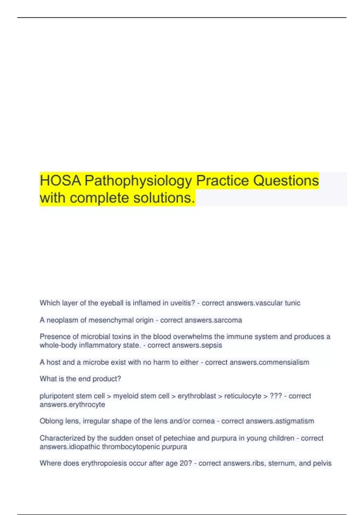 HOSA Pathophysiology Practice Questions with complete solutions. Which layer of the eyeball is inflamed in uveitis? - correct lar tunic A neoplasm of mesenchymal origin - correct ma Presence of microbial toxins in the blood overwhelms the immune system and produces a whole-body inflammatory state. - correct s A host and a microbe exist with no harm to either - correct nsialism What is the end product? pluripotent stem cell > myeloid stem cell > erythroblast > reticulocyte > ??? - correct rocyte Oblong lens, irregular shape of the lens and/or cornea - correct matism Characterized by the sudden onset of petechiae and purpura in young children - correct athic thrombocytopenic purpura Where does erythropo