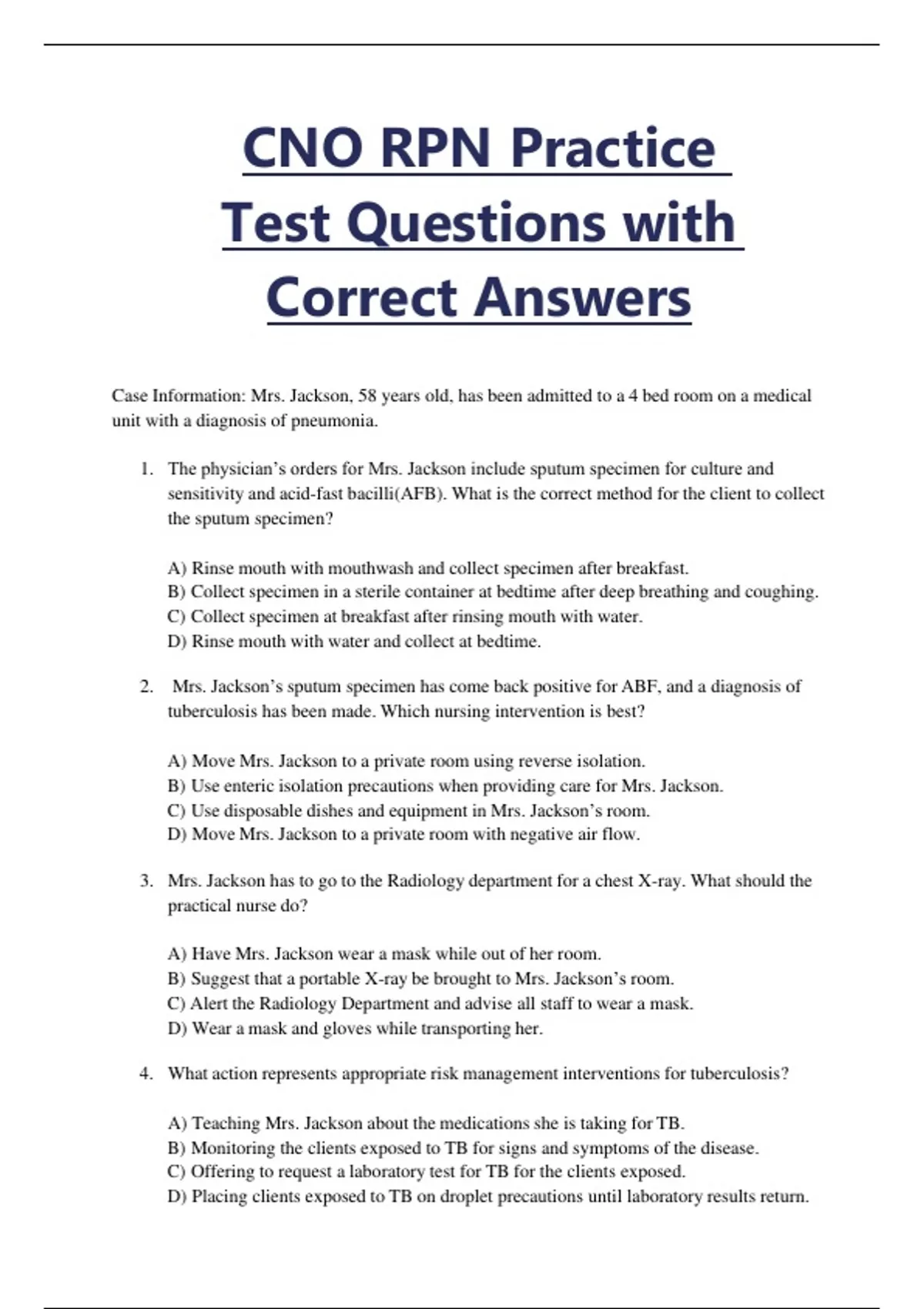 CNO RPN Practice Test Questions with Correct Answers 1. The physician’s orders for Mrs. Jackson include sputum specimen for culture and sensitivity and acid-fast bacilli(AFB). What is the correct method for the client to collect the sputum specimen? A) Rinse mouth with mouthwash and collect specimen after breakfast. B) Collect specimen in a sterile container at bedtime after deep breathing and coughing. C) Collect specimen at breakfast after rinsing mouth with water. D) Rinse mouth with water and collect at bedtime. 2. Mrs. Jackson’s sputum specimen has come back positive for ABF, and a diagnosis of tuberculosis has been made. Which nursing intervention is best? A) Move Mrs. Jackson to a private room using reverse isolation. B) Use enteric isolation precautions when providing care for Mrs. Jackson. C) Use disposable dishes and equipment in Mrs. Jackson’s room. D) Move Mrs. Jackson to a private room with negative air flow. 3. Mrs. Jackson has to go to the Radiology department for a chest X-ray. What should the practical nurse do? A) Have Mrs. Jackson wear a mask while out of her room. B) Suggest that a portable X-ray be brought to Mrs. Jackson’s room. C) Alert the Radiology Department and advise all staff to wear a mask. D) Wear a mask and gloves while transporting her. 4. What action represents appropriate risk management interventions for tuberculosis? A) Teaching Mrs. Jackson about the medications she is taking for TB. B) Monitoring the clients exposed to TB for signs and symptoms of the disease. C) Offering to request a laboratory test for TB for the clients exposed. D) Placing clients exposed to TB on droplet precautions until laboratory results return.
