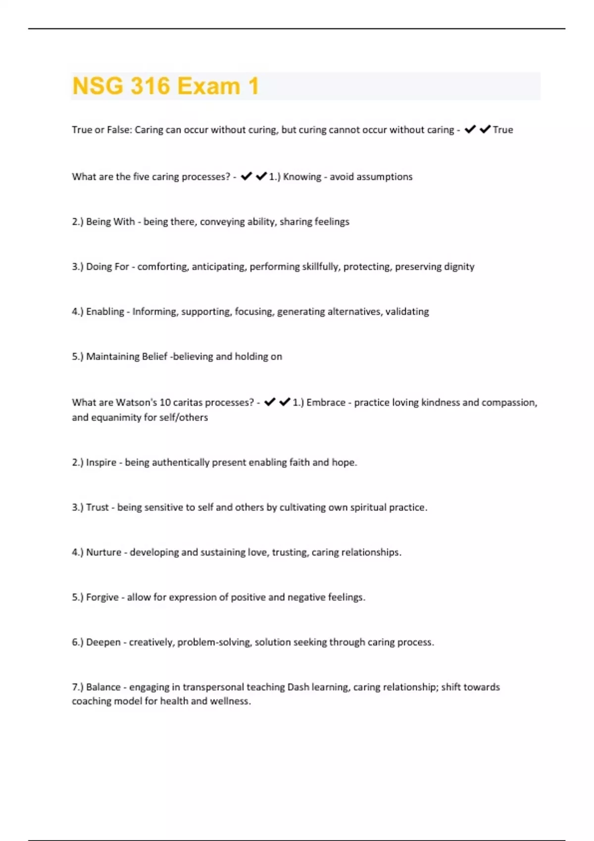True or False: Caring can occur without curing, but curing cannot occur without caring - True What are the five caring processes? - 1.) Knowing - avoid assumptions 2.) Being With - being there, conveying ability, sharing feelings 3.) Doing For - comforting, anticipating, performing skillfully, protecting, preserving dignity 4.) Enabling - Informing, supporting, focusing, generating alternatives, validating 5.) Maintaining Belief -believing and holding on What are Watson's 10 caritas processes? - 1.) Embrace - practice loving kindness and compassion, and equanimity for self/others 2.) Inspire - being authentically present enabling faith and hope. 3.) Trust - being sensitive to self and others by cultivating own spiritual practice. 4.) Nurture - developing and sustaining love, trusting, caring relationships. 5.) Forgive - allow for expression of positive and negative feelings. 6.) Deepen - creatively, problem-solving, solution seeking through caring process. 7.) Balance - engaging in transpersonal teaching Dash learning, caring relationship; shift towards coaching model for health and wellness.8.) Co-create - creating a healing environment at all levels 9.) Minister - reverentially assisting with basic needs as secret acts; touching the spirit of others; sustaining human dignity 10.) Open - opening to existential - spiritual, mystery, unknowns - allowing for miracles. Fill in the blank: Burnout has three dimensions - _____ (negative physical and emotional manifestations with stressors), _____ (detached from one's job), _____ (dissatisfaction with one's performance) - exhaustion, depersonalization, inefficiencies