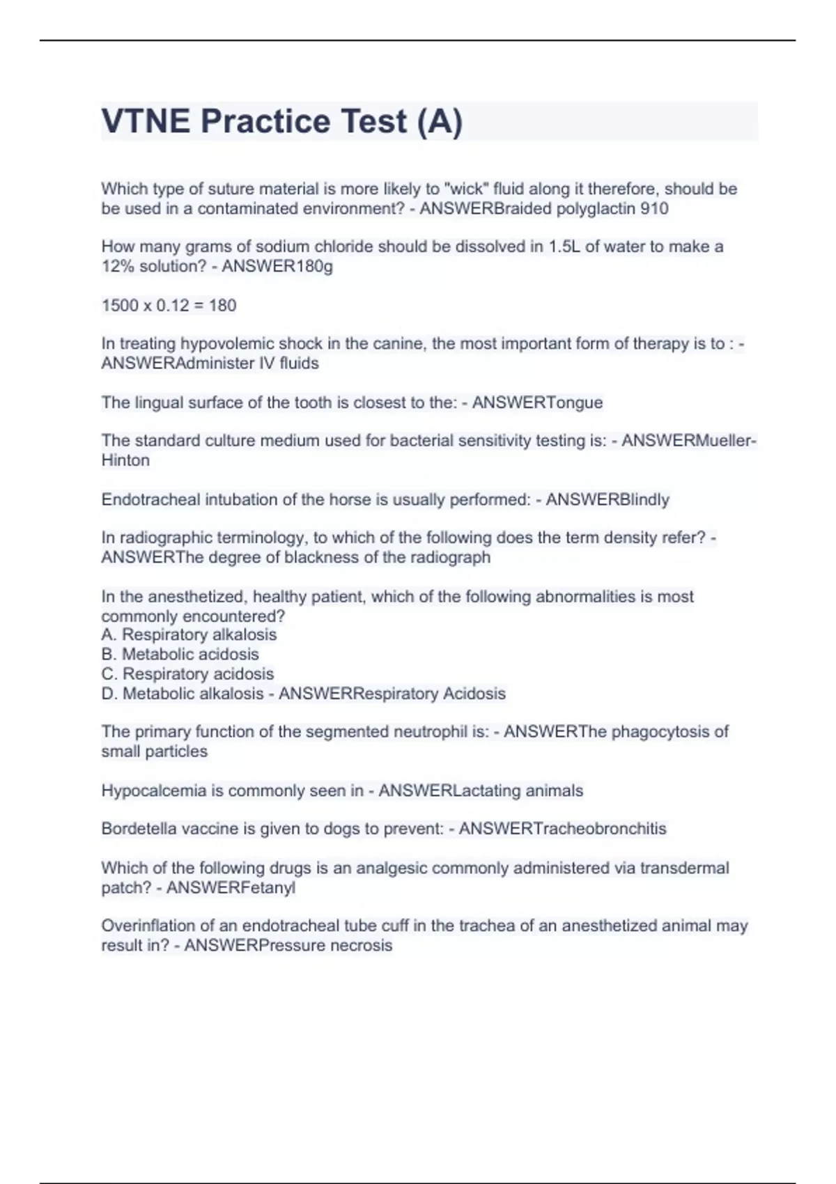 Exam of 8 pages for the course VTNE at VTNE (VTNE Practice Test.)