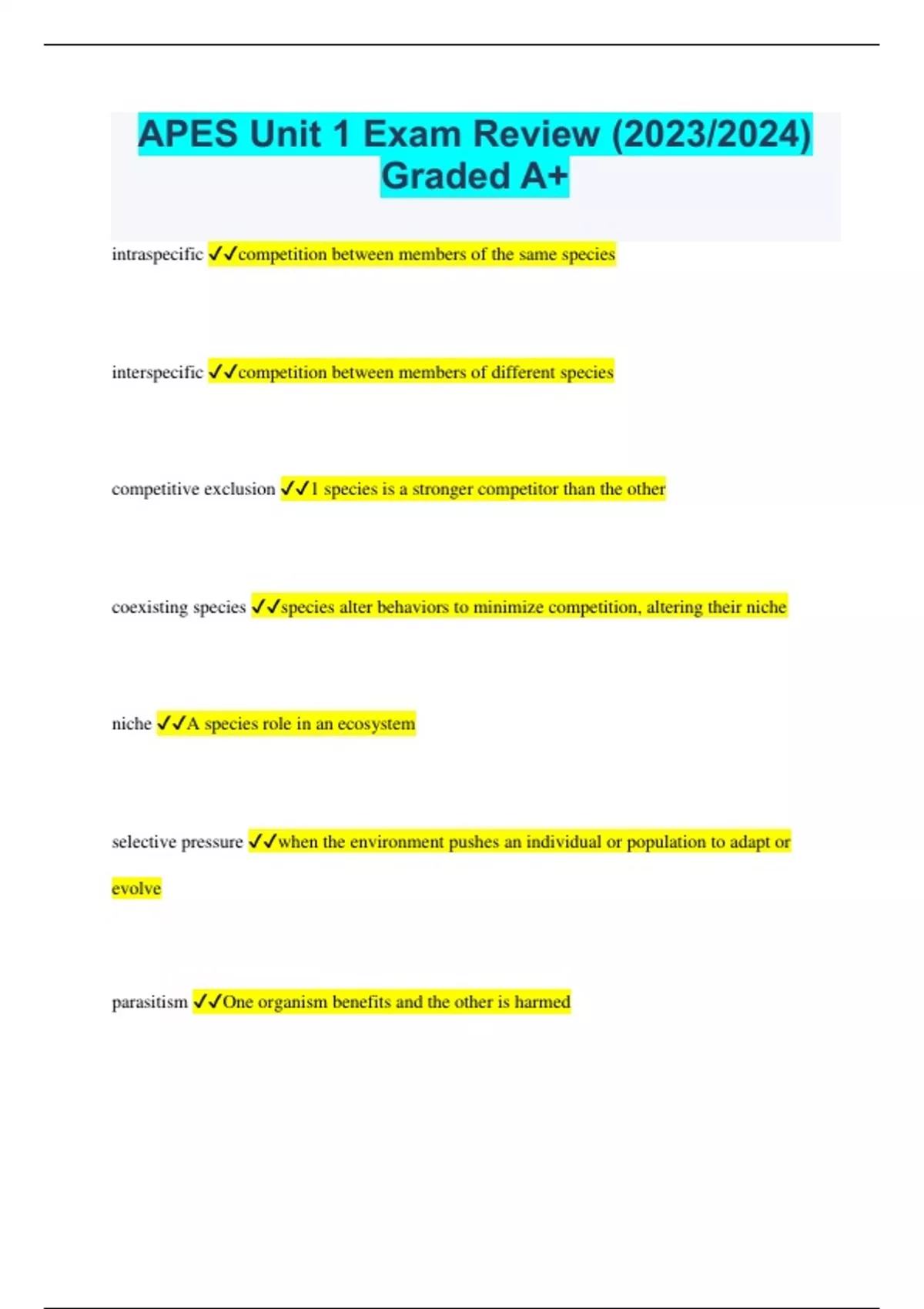 APES Unit 1 Exam Review (2023/2024) Graded A+
