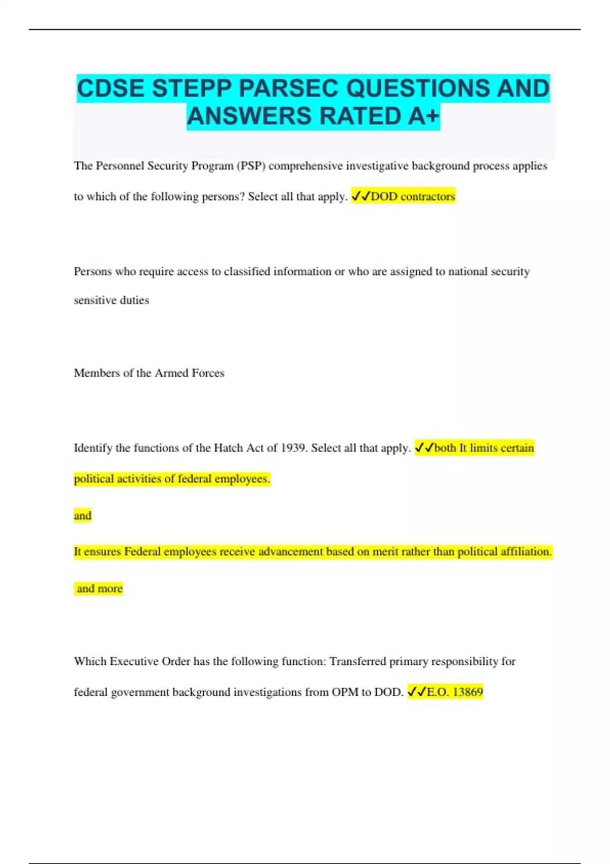 CDSE STEPP PARSEC QUESTIONS AND ANSWERS RATED A+ The Personnel Security Program (PSP) comprehensive investigative background process applies to which of the following persons? Select all that apply. DOD contractors Persons who require access to classified information or who are assigned to national security sensitive duties Members of the Armed Forces Identify the functions of the Hatch Act of 1939. Select all that apply. both It limits certain political activities of federal employees. and It ensures Federal employees receive advancement based on merit rather than political affiliation. and more Which Executive Order has the following function: Transferred primary responsibility for federal government background investigations from OPM to DOD. E.O. 13869 Which document established standard requirements for conducting federal background investigations according to a five-tiered model? not DODM 5200.02 National security position designations are based on which of the following? Select all that apply. Duties by which the occupant could bring about an adverse effect on national security Access to classified information Which of the following best describes "national security eligibility?" A favorable determination for access to classified information or assignment to a national security sensitive position prior to granting access Identify responsibilities for which critical-sensitive designation applies. Select all that apply. . National security policy-making or policy-determining positions not Unique intelligence-related information Individuals requiring access to Sensitive Compartmented Information (SCI) in the performance of their duties may require which of the following A more extensive national security background investigation National security eligibility grants access to classified information. False Circumstances may arise where an urgent operational or contractual exigency exists for cleared DOD personnel to have one-time or short-duration access to classified information at a higher level than authorized by the existing eligibility level True Match each FIS tier to its description. critical tier 5 non-sensitive, low risk tier 1 non-sensitive, moderate risk tier 2 non-critical-sensitive tier 3 John's preliminary background investigation flagged a potential issue that requires resolution before his investigation can be finalized. What needs to occur before John's background investigation can be adjudicated? not Intervention by John's DOD organization The adjudicative process is: not used to investigate and clear federal civilian employees and military personnel for access to special compartmented information. Identify the purpose for "Continuous Evaluation" (CE). To assure the ongoing trustworthiness of an individual, even after reaching a personnel security determination The Continuous Evaluation process supplements scheduled periodic reinvestigations of all cleared persons. True Which of the following issues may draw attention in the Continuous Evaluation (CE) process for a person with national security eligibility? Select all that apply. Physical altercations or significant destruction of U.S. Government property and An incident or behavior that will be reported to the Military Department CI Organization and An abrupt and significant change in an individual's appearance or behavior suggesting impaired judgment or stability Identify Security Specialist responsibilities. Select all that apply. Evaluate information for Temporary (or Interim) National Security Eligibility Train personnel on requirements for the Personnel Security Program In your role as a Security Specialist, you learn that John often fails to place security sensitive documents in a safe, secure, locked location at the end of the day. John's actions represent which of the reportable actions: An unwillingness to comply with rules and regulations or to cooperate with security requirements Individuals who have access to classified information or hold a sensitive position must follow strict reporting requirements for what primary reason? To recognize and avoid personal behaviors and activities that may adversely affect continued national security eligibility True/False. Annual or refresher briefings are unnecessary for those personnel who have had no security violations in a 12-month period. False Identify the function of Executive Order 13467. Select all that apply. Authorizes continuous evaluation of personnel who hold an active security clearance. Designates the Director of National Intelligence as the "Security Executive Agent" with responsibility over security and public trust clearance processing. What was the prevailing means of appointing federal employees prior to the Civil Service Act of 1883? not the civil service system Match each statement with its applicable security policy. Establishes requirements for conducting background investigations for the five-tiered investigative model. = Federal Investigative Standards Serves as the mandatory Personnel Security Program document for use by all DOD components. != EO13467 Authorizes continuous evaluation of personnel who hold active security clearances. != SEAD 6 Establishes policy and requirements for the CE of individuals and modernizes the background investigation process by maximizing automated records checks. != DOD Manual 5200.02 Establishes security requirements for government employment. != EO13467 Match each position designation with an accurate statement. Special-sensitive = Civilian positions that the DOD Component head determines to be at a higher level than critical-sensitive due to its special requirements Non-sensitive = Positions that pose no potentially adverse effect on national security Noncritical-sensitive = Positions not requiring eligibility for access to classified information, but having potential to cause significant or serious damage Critical-sensitive = National security policy-making or policy-determining positions When may personnel 
