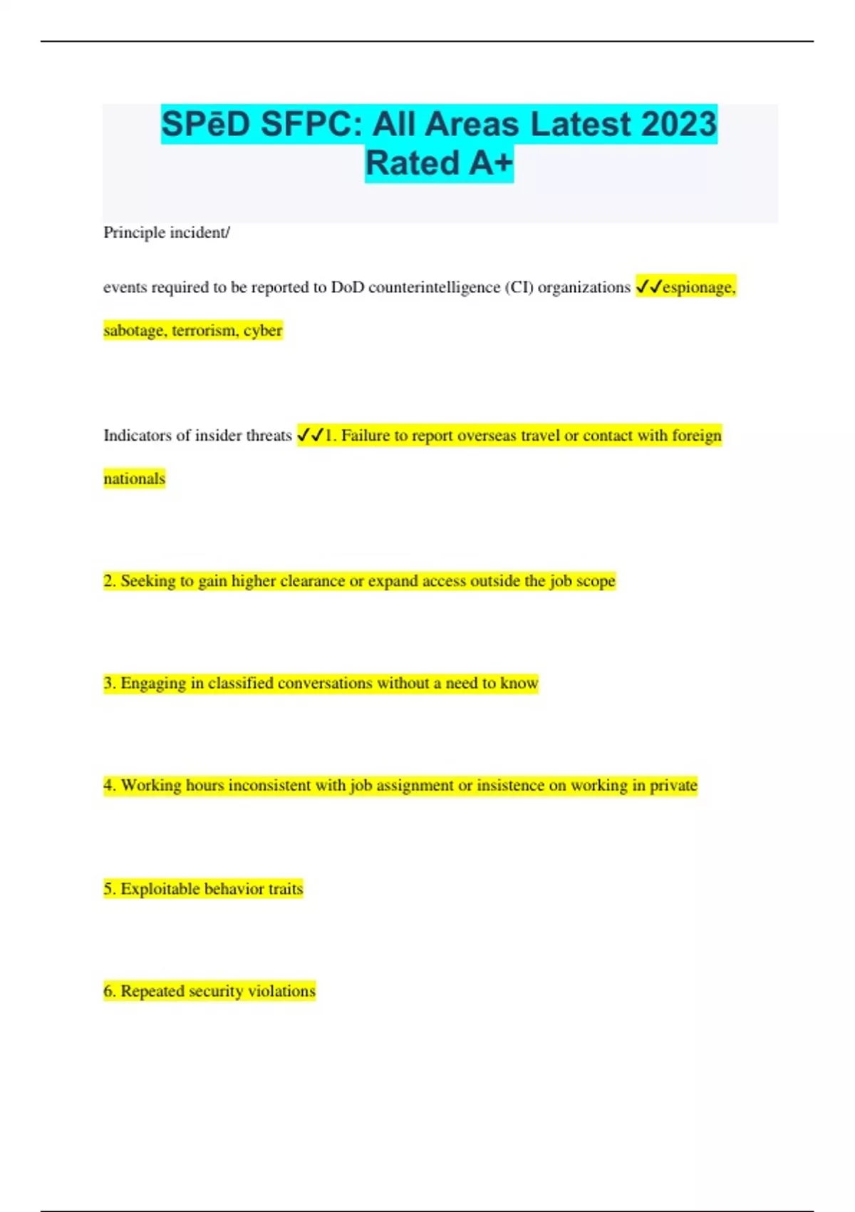 SPēD SFPC: All Areas Latest 2023 Rated A+ Principle incident/ events required to be reported to DoD counterintelligence (CI) organizations espionage, sabotage, terrorism, cyber Indicators of insider threats 1. Failure to report overseas travel or contact with foreign nationals 2. Seeking to gain higher clearance or expand access outside the job scope 3. Engaging in classified conversations without a need to know 4. Working hours inconsistent with job assignment or insistence on working in private 5. Exploitable behavior traits 6. Repeated security violations 7. Attempting to enter areas not granted access to 8. Unexplainable affluence/living above one's means 9. Anomalies (adversary taking actions which indicate they are knowledgeable to information) 10. Illegal downloads of information/files Elements that should be considered in identifying Critical Program Information Elements which if compromised could: 1. cause significant degradation in mission effectiveness, 2. shorten the expected combat-effective life of the system 3. reduce technological advantage 4. significantly alter program direction; or 5. enable an adversary to defeat, counter, copy, or reverseengineer the technology or capability. asset, threat, vulnerability, risk, countermeasures Elements that a security professional should consider when assessing and managing risks to DoD assets The three categories of Special Access Programs acquisition, intelligence, and operations and support Three different types of threats to classified information Insider Threat, Foreign Intelligence Entities (FIE) and Cybersecurity Threat The concept of an insider threat An employee who may represent a threat to national security. These threats encompass potential espionage, violent acts against the Government or the nation, and unauthorized disclosure of classified information, including the vast amounts of classified data available on interconnected United States Government computer networks and systems. The purpose of the Foreign Visitor Program To track and approve access by a foreign entity to information that is classified; and to approve access by a foreign entity to information that is unclassified, related to a U.S. Government contract, or plant visits covered by ITAR. Special Access Program A program established for a specific class of classified information that imposes safeguarding and access requirements that exceed those normally required for information at the same classification level. Enhanced security requirements for protecting Special Access Program (SAP) information Within Personnel Security: • Access Rosters; • Billet Structures (if required); • Indoctrination Agreement; • Clearance based on an appropriate investigation completed within the last 5 years; • Individual must materially contribute to the program in addition to having the need to know;