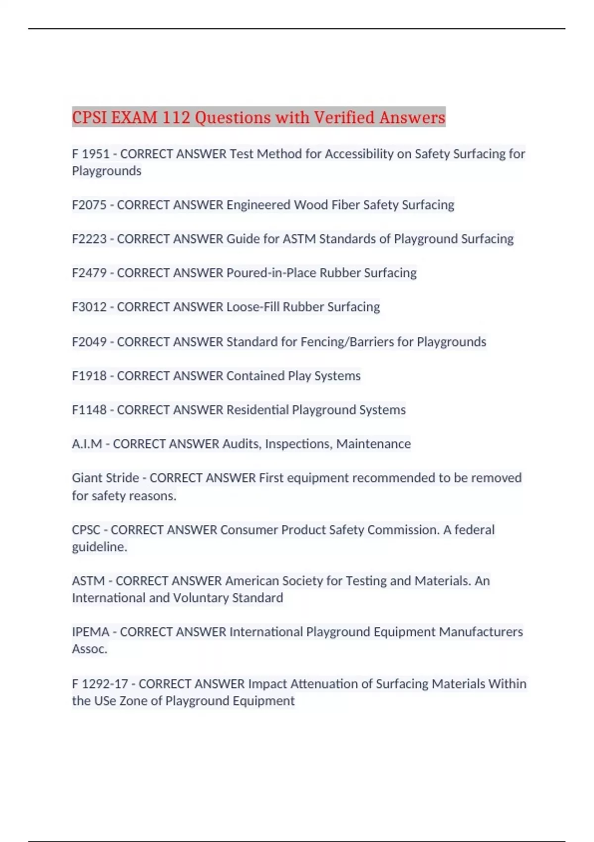 CPSI EXAM 112 Questions with Verified Answers F 1951 - CORRECT ANSWER Test Method for Accessibility on Safety Surfacing for Playgrounds F2075 - CORRECT ANSWER Engineered Wood Fiber Safety Surfacing F2223 - CORRECT ANSWER Guide for ASTM Standards of Playground Surfacing F2479 - CORRECT ANSWER Poured-in-Place Rubber Surfacing F3012 - CORRECT ANSWER Loose-Fill Rubber Surfacing F2049 - CORRECT ANSWER Standard for Fencing/Barriers for Playgrounds F1918 - CORRECT ANSWER Contained Play Systems F1148 - CORRECT ANSWER Residential Playground Systems A.I.M - CORRECT ANSWER Audits, Inspections, Maintenance Giant Stride - CORRECT ANSWER First equipment recommended to be removed for safety reasons. CPSC - CORRECT ANSWER Consumer Product Safety Commission. A federal guideline. ASTM - CORRECT ANSWER American Society for Testing and Materials. An International and Voluntary Standard IPEMA - CORRECT ANSWER International Playground Equipment Manufacturers Assoc. F 1292-17 - CORRECT ANSWER Impact Attenuation of Surfacing Materials Within the USe Zone of Playground Equipment Entanglement - CORRECT ANSWER Most common cause of playground fatalities Falls - CORRECT ANSWER Most common cause of injury on public playgrounds Priority 1 Hazard - CORRECT ANSWER A readily accessible hazard that would cause an accident which would result in: Death, Brain Damage, Permanent Paralysis, Loss of Vision, Loss of Limb, Loss of Speech, Organ Destruction F 1487 - CORRECT ANSWER Standards Specs for Playgrounds for Public Use Range of Users - CORRECT ANSWER 5th percentile 2 year old to 95th percentile 12 year old 72 inches - CORRECT ANSWER Distance for use zone perimeter at which F1487 does not apply to benches, shade structures, litter barrels, drinking fountains and containment borders Pre-school - CORRECT ANSWER Ages 2-5 School Age - CORRECT ANSWER Ages 5-12 Toddlers - CORRECT ANSWER 6-23 month 7 inches - CORRECT ANSWER For overhead swinging rings the length of the chain must not exceed ____________________________. 15 inches - CORRECT ANSWER The overall length of rings and chains should not exceed ____________________________________. Log Rolls, Track Rides, Vertical Sliding Poles, Spiral Slides 360 degrees - CORRECT ANSWER Play equipment not recommended for preschool users. 84 inches - CORRECT ANSWER There must be no obstructions within __________________ above each designated playing surface, use zone and pivot point of swings 1978 - CORRECT ANSWER Year that lead paint was banned 50 lbs - CORRECT ANSWER Amount of force required to push a probe through a completely bounded non-rigid opening 55 degrees - CORRECT ANSWER Angle on a fish or wedge probe 24 inches - CORRECT ANSWER Height above protective surfacing at which an opening is exempt Projection - CORRECT ANSWER A part of playground equipment that extends or juts out beyond the adjacent surface Protrusion - CORRECT ANSWER projections that can spike, pierce or stab a child, enter an eye socket, or bruise and internal organ 4 - CORRECT ANSWER Number of gauges used to identify projections .12 inches (1/8th) - CORRECT ANSWER projections greater than ________________ are not allowed within the 21 inch slide non-entanglement zone More than 2 - CORRECT ANSWER number of exposed threads to be considered an entanglement hazard .04 inches - CORRECT ANSWER S-hook gap should be no greater than __________________ 1/8th inch - CORRECT ANSWER Vertical projection gauge thickness 3/16th inch - CORRECT ANSWER Size of roller slide test probe 5/16th inch - CORRECT ANSWER Size of Merry go round test probe 5/8th inches - CORRECT ANSWER Size of crush and shear probe .62 inches - CORRECT ANSWER Minimum size of flexible hand gripping components 3/4 inches - CORRECT ANSWER Minimum insertion depth of partially bounded opening probe .95 inches - CORRECT ANSWER Minimum diameter of rigid hand gripping components and handrails 1.5 inches - CORRECT ANSWER Inside diameter of middle projection gauge 1.55 inches - CORRECT ANSWER Maximum diameter of rigid and flexible handgripping components 1.875 - CORRECT ANSWER Neck width of partially bounded opening probe 3 inches - CORRECT ANSWER Length of partially bounded neck probe 3 inches - CORRECT ANSWER Inside diameter of large projection gauge 3.5 inches - CORRECT ANSWER Torso probe thickness 4 inches - CORRECT ANSWER Minimum insertion depth of torso probe 8.5 inches - CORRECT ANSWER Shoulder width of partially bounded opening probe 9 inches - CORRECT ANSWER Diameter of head probe 12 inches - CORRECT ANSWER Maximum distance between stepping forms for 2-5 year olds 15 inches - CORRECT ANSWER Maximum clear opening without a top horizontal guardrail 18 inches - CORRECT ANSWER Maximum distance between forms for 5-12 year olds 20 inches - CORRECT ANSWER Maximum height without guardrails for 2-5 year olds 20 inches - CORRECT ANSWER Maximum height difference of guardrails on upper platform for 2-5 year olds 21 inches - CORRECT ANSWER Slide entanglement zone 23 inches - CORRECT ANSWER Maximum height for lower guardrail for children ages 2-5 28 inches - CORRECT ANSWER Maximum height of lower guard rail for children ages 5-12 29 inches - CORRECT ANSWER Maximum height of upper rail for children ages 2-5 29 inches - CORRECT ANSWER Minimum height of upper barrier rail for children ages 2-5 30 inches - CORRECT ANSWER Maximum height without barriers for ages 2-5 30 inches - CORRECT ANSWER Maximum height without guardrails for ages 5-12 38 inches - CORRECT ANSWER Minimum height of upper rail on guardrails for children 5-12 38 inches - CORRECT ANSWER Minimum height of upper rail for barriers for children ages 5-12 72 inches - CORRECT ANSWER Minimum use zone for sitting rocking/swinging equipment 72 inches - CORRECT ANSWER Minimum side use zone for rotating swing support structure 72 inches - CORRECT ANSWER Slide exit region use zone 72 inches - CORRECT ANSWER minimum use zone for to-fro swing support structure 72 inches - CORRECT ANSWER Clearance area without rigid structural co