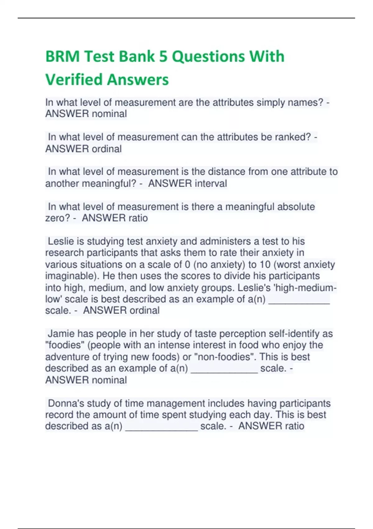 BRM Test Bank 5 Questions With Verified Answers In what level of measurement are the attributes simply names? - ANSWER nominal In what level of measurement can the attributes be ranked? - ANSWER ordinal In what level of measurement is the distance from one attribute to another meaningful? - ANSWER interval In what level of measurement is there a meaningful absolute zero? - ANSWER ratio Leslie is studying test anxiety and administers a test to his research participants that asks them to rate their anxiety in various situations on a scale of 0 (no anxiety) to 10 (worst anxiety imaginable). He then uses the scores to divide his participants into high, medium, and low anxiety groups. Leslie's 'high-mediumlow' scale is best described as an example of a(n) ___________ scale. - ANSWER ordinal Jamie has people in her study of taste perception self-identify as "foodies" (people with an intense interest in food who enjoy the adventure of trying new foods) or "non-foodies". This is best described as an example of a(n) ____________ scale. - ANSWER nominal Donna's study of time management includes having participants record the amount of time spent studying each day. This is best described as a(n) _____________ scale. - ANSWER ratio