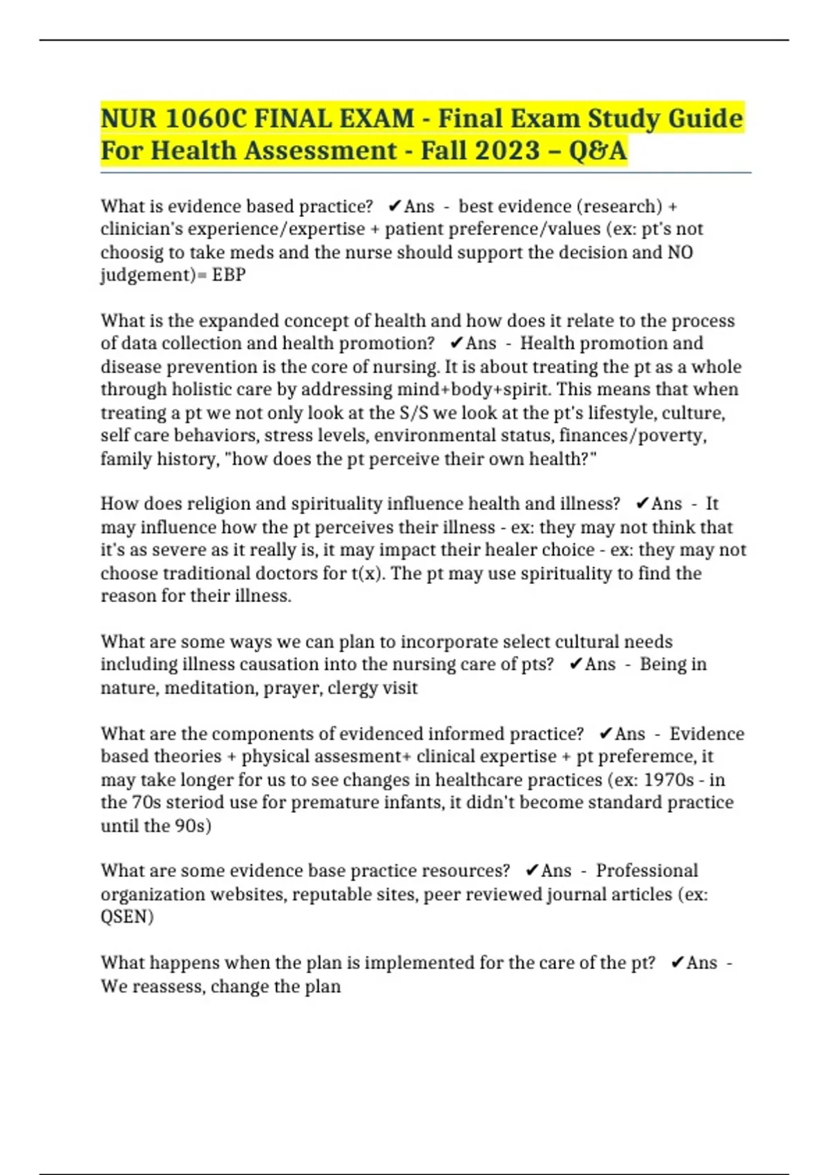NUR 1060C FINAL EXAM - Final Exam Study Guide For Health Assessment - Fall 2023 – Q&A