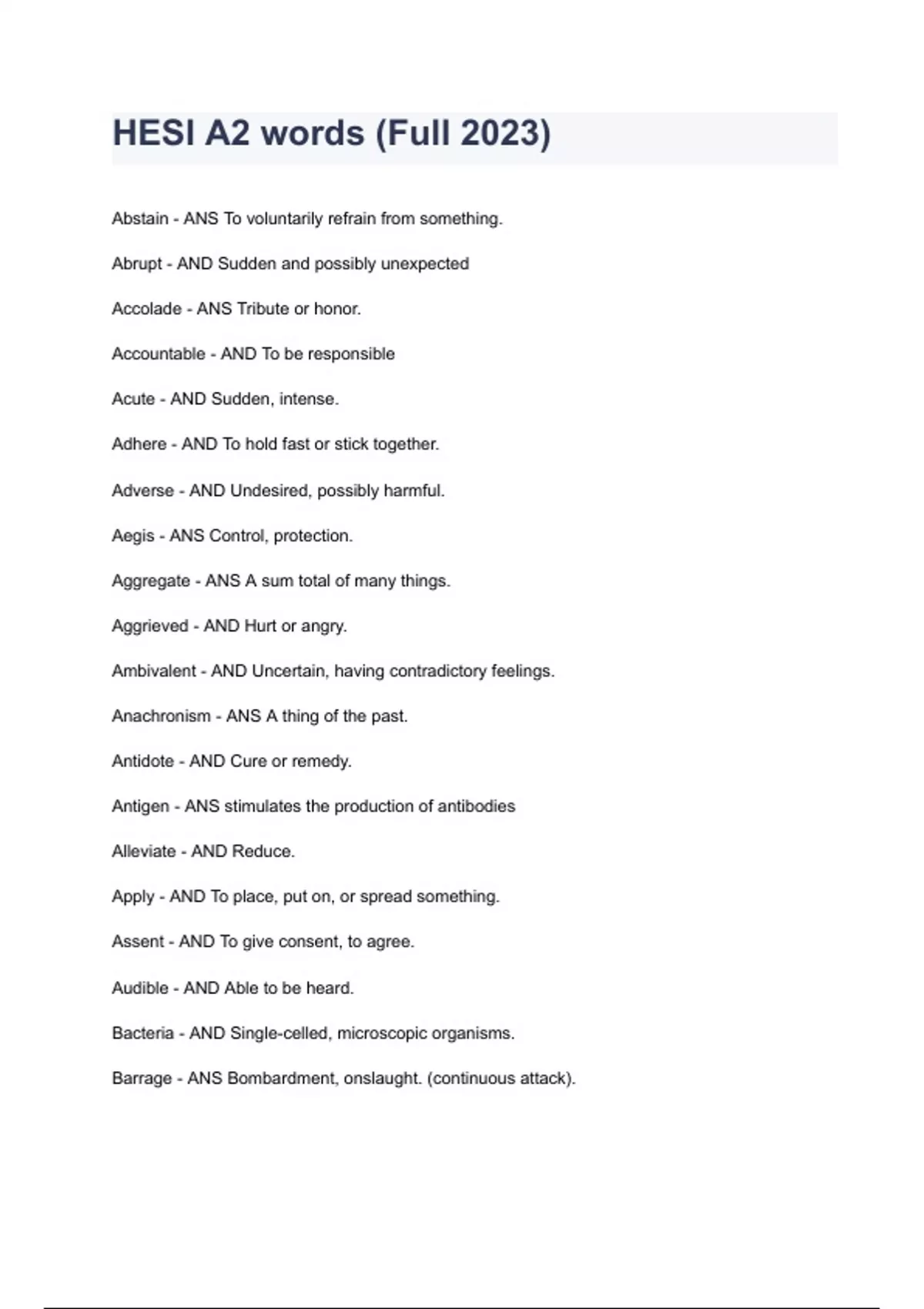 HESI A2 words (Full 2023/2024) Test With Complete Solutions.