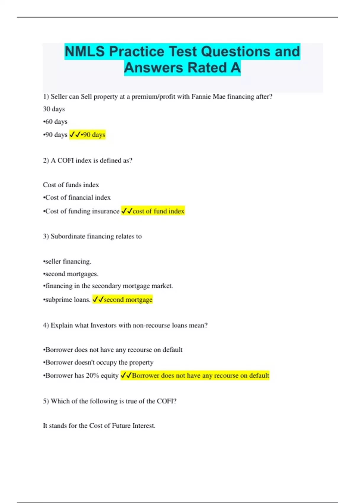 NMLS Practice Test Questions and Answers Rated A 1) Seller can Sell property at a premium/profit with Fannie Mae financing after? 30 days •60 days •90 days •90 days 2) A COFI index is defined as? Cost of funds index •Cost of financial index •Cost of funding insurance cost of fund index 3) Subordinate financing relates to •seller financing. •second mortgages. •financing in the secondary mortgage market. •subprime loans. second mortgage 4) Explain what Investors with non-recourse loans mean? •Borrower does not have any recourse on default •Borrower doesn't occupy the property •Borrower has 20% equity Borrower does not have any recourse on default 5) Which of the following is true of the COFI? It stands for the Cost of Future Interest.