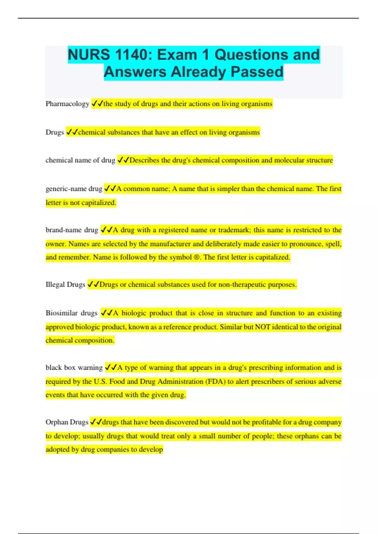 NURS 1140: Exam 1 Questions and Answers Already Passed Pharmacology the study of drugs and their actions on living organisms Drugs chemical substances that have an effect on living organisms chemical name of drug Describes the drug's chemical composition and molecular structure generic-name drug A common name; A name that is simpler than the chemical name. The first letter is not capitalized. brand-name drug A drug with a registered name or trademark; this name is restricted to the owner. Names are selected by the manufacturer and deliberately made easier to pronounce, spell, and remember. Name is followed by the symbol ®. The first letter is capitalized. Illegal Drugs Drugs or chemical substances used for non-therapeutic purposes. Biosimilar drugs A biologic product that is close in structure and function to an existing approved biologic product, known as a reference product. Similar but NOT identical to the original chemical composition. black box warning A type of warning that appears in a drug's prescribing information and is required by the U.S. Food and Drug Administration (FDA) to alert prescribers of serious adverse events that have occurred with the given drug. Orphan Drugs drugs that have been discovered but would not be profitable for a drug company to develop; usually drugs that would treat only a small number of people; these orphans can be adopted by drug companies to develop Schedule 1 drugs Highest potential for abuse, no therapeutic use, (Heroine marijuana LSD) Schedule 2 drugs • High abuse potential • Accepted medical use • Severe physical and/or psychological dependence (Percocet, Vicodin, Adderall, etc) Schedule 3 drugs Accepted medical uses Moderate or low physical dependence High psychological dependence (Aspirin w/ Codein; Tylenol w/ Codeine)