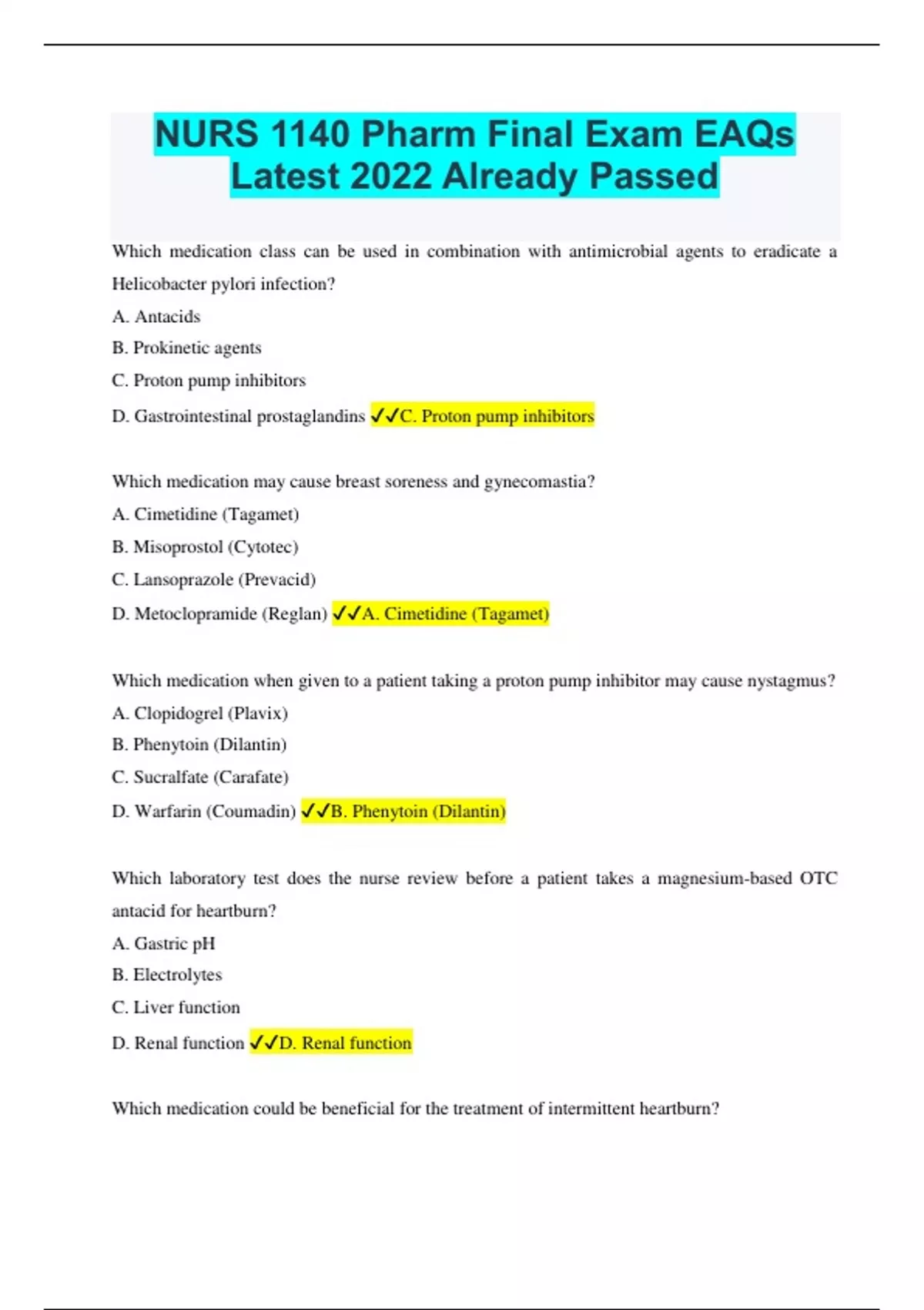 Which medication class can be used in combination with antimicrobial agents to eradicate a Helicobacter pylori infection? A. Antacids B. Prokinetic agents C. Proton pump inhibitors D. Gastrointestinal prostaglandins C. Proton pump inhibitors Which medication may cause breast soreness and gynecomastia? A. Cimetidine (Tagamet) B. Misoprostol (Cytotec) C. Lansoprazole (Prevacid) D. Metoclopramide (Reglan) A. Cimetidine (Tagamet) Which medication when given to a patient taking a proton pump inhibitor may cause nystagmus? A. Clopidogrel (Plavix) B. Phenytoin (Dilantin) C. Sucralfate (Carafate) D. Warfarin (Coumadin) B. Phenytoin (Dilantin) Which laboratory test does the nurse review before a patient takes a magnesium-based OTC antacid for heartburn? A. Gastric pH B. Electrolytes C. Liver function D. Renal function D. Renal function Which medication could be beneficial for the treatment of intermittent heartburn?