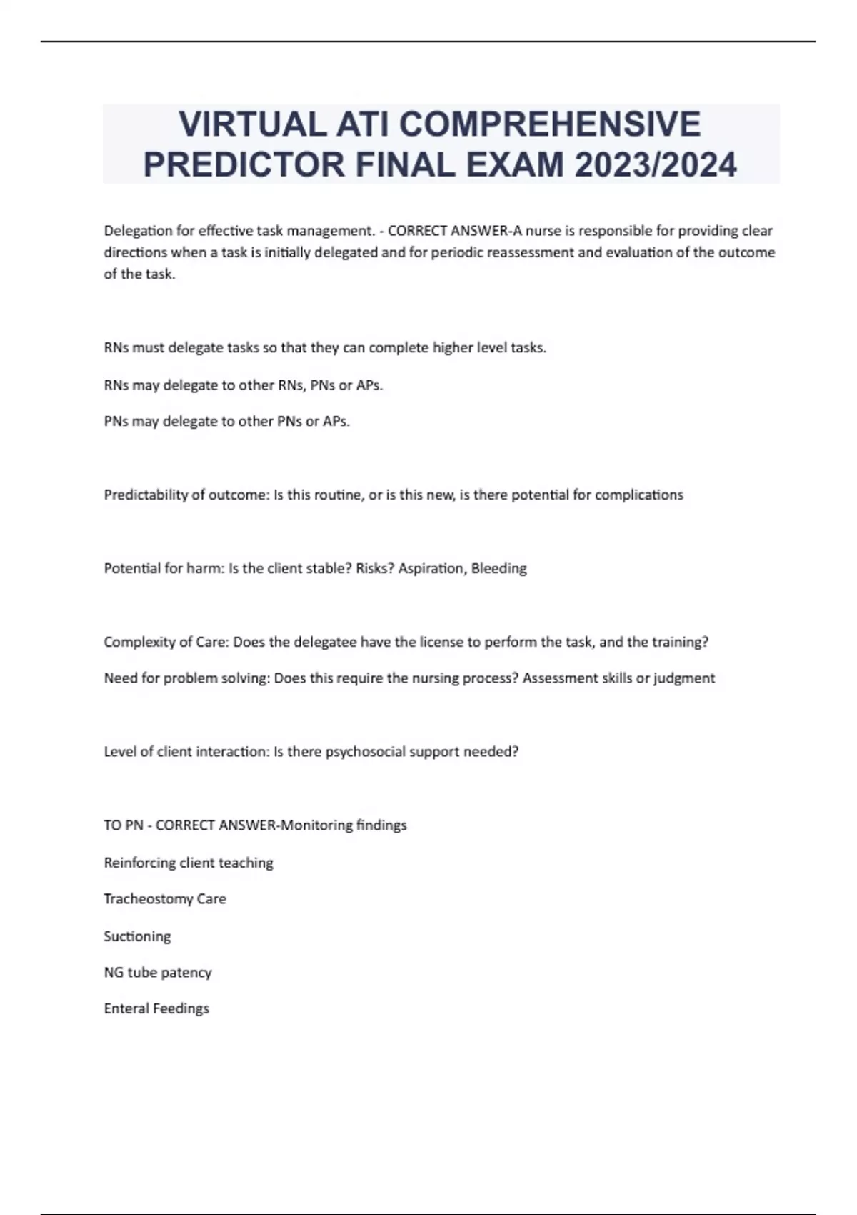 VIRTUAL ATI COMPREHENSIVE PREDICTOR FINAL EXAM 2023/2024 Delegation for effective task management. - CORRECT ANSWER-A nurse is responsible for providing clear directions when a task is initially delegated and for periodic reassessment and evaluation of the outcome of the task. RNs must delegate tasks so that they can complete higher level tasks. RNs may delegate to other RNs, PNs or APs. PNs may delegate to other PNs or APs. Predictability of outcome: Is this routine, or is this new, is there potential for complications Potential for harm: Is the client stable? Risks? Aspiration, Bleeding Complexity of Care: Does the delegatee have the license to perform the task, and the training? Need for problem solving: Does this require the nursing process? Assessment skills or judgment Level of client interaction: Is there psychosocial support needed? TO PN - CORRECT ANSWER-Monitoring findings Reinforcing client teaching Tracheostomy Care Suctioning NG tube patency Enteral Feedings