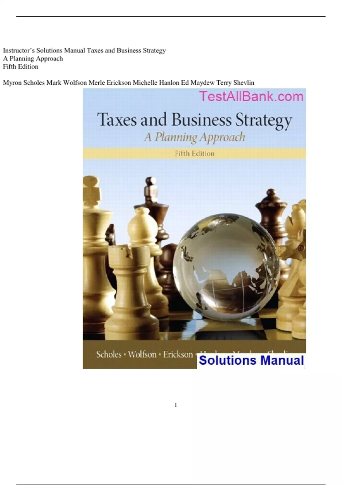 Taxes and Business Strategy 5th Edition Scholes Solutions Manual Taxes and Business Strategy 5th Edition Scholes Solutions Manual. This is NOT the TEXT BOOK. You are buying SOLUTIONS MANUAL for Taxes and Business Strategy 5th Edition by Scholes. Solutions Manual comes in a PDF or Word format and available for download only. Taxes and Business Strategy 5th Edition Scholes Scholes Solutions Manual only NO Test Bank for the Text book included on this purchase. If you want the Test Bank please search on the search box. All orders are placed anonymously. Your purchase details will be hidden according to our website privacy and be deleted automatically.
