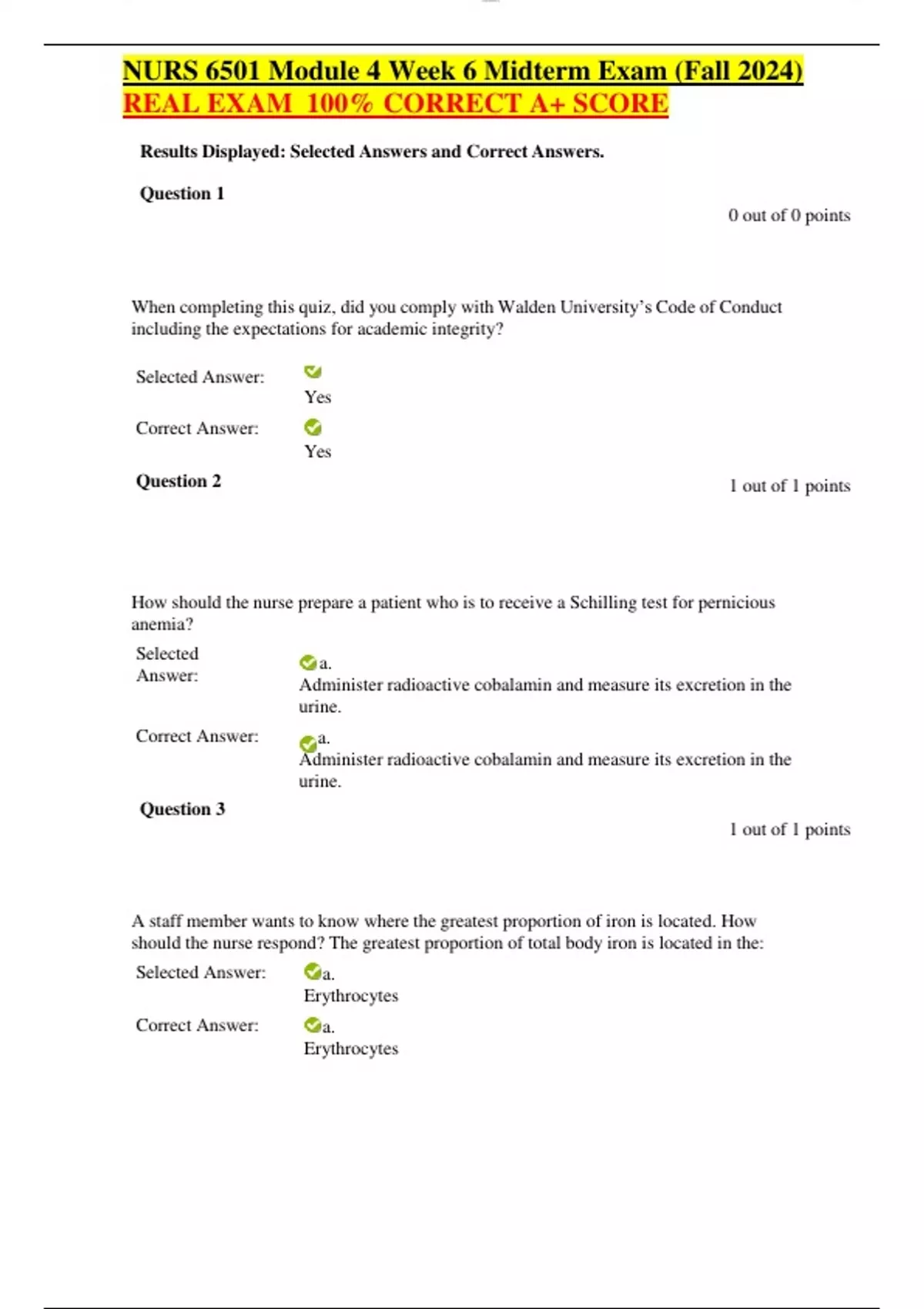 NURS 6501 Module 4 Week 6 Midterm Exam (Fall 2024) REAL EXAM 100% CORRECT A+ SCORE When completing this quiz, did you comply with Walden University’s Code of Conduct including the expectations for academic integrity? Selected Answer: Correct Answer: Question 2 Yes Yes 1 out of 1 points How should the nurse prepare a patient who is to receive a Schilling test for pernicious anemia? Selected Answer: a. Administer radioactive cobalamin and measure its excretion in the urine. Correct Answer: a. Administer radioactive cobalamin and measure its excretion in the urine. Question 3 1 out of 1 points A staff member wants to know where the greatest proportion of iron is located. How should the nurse respond? The greatest proportion of total body iron is located in the: Selected Answer: a. Erythrocytes Correct Answer: a. Erythrocytes Question 4 1 out of 1 points A 21-year-old female was recently diagnosed with iron deficiency anemia. In addition to fatigue and weakness, which of the following clinical signs and symptoms would she most likely exhibit? Selected Answer: b. Spoon-shaped nails Correct Answer: b. Spoon-shaped nails Question 5 1 out of 1 points The people from which country have the lowest risk for Hodgkin lymphoma? Selected Answer: b. Japan Correct Answer: b. Japan Question 6 1 out of 1 points During an infection, the nurse assesses the lymph nodes. Lymph nodes enlarge and become tender because: Selected Answer: a. Lymphocytes are rapidly dividing. Correct Answer: a. Lymphocytes are rapidly dividing. Question 7 1 out of 1 points A nurse monitors for the most common childhood cancer, which is: Selected Answer: a. Acute lymphoblastic leukemia (ALL)