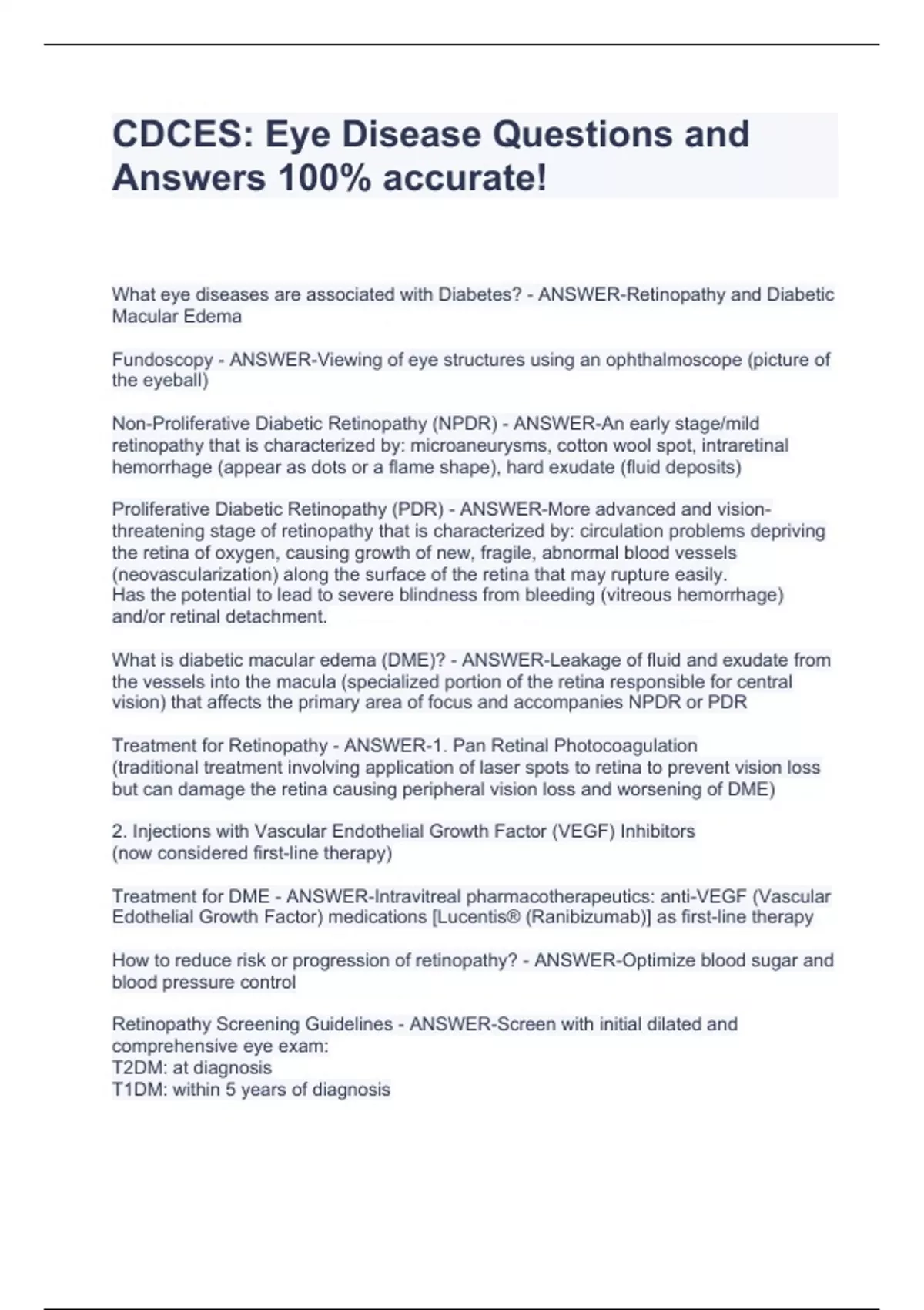CDCES: Eye Disease Questions and Answers 100% accurate! CDCES: Eye Disease Questions and Answers 100% accurate! What eye diseases are associated with Diabetes? - ANSWER-Retinopathy and Diabetic Macular Edema Fundoscopy - ANSWER-Viewing of eye structures using an ophthalmoscope (picture of the eyeball) Non-Proliferative Diabetic Retinopathy (NPDR) - ANSWER-An early stage/mild retinopathy that is characterized by: microaneurysms, cotton wool spot, intraretinal hemorrhage (appear as dots or a flame shape), hard exudate (fluid deposits) Proliferative Diabetic Retinopathy (PDR) - ANSWER-More advanced and vision-threatening stage of retinopathy that is characterized by: circulation problems depriving the retina of oxygen, causing growth of new, fragile, abnormal blood vessels (neovascularization) along the surface of the retina that may rupture easily. Has the potential to lead to severe blindness from bleeding (vitreous hemorrhage) and/or retinal detachment.
