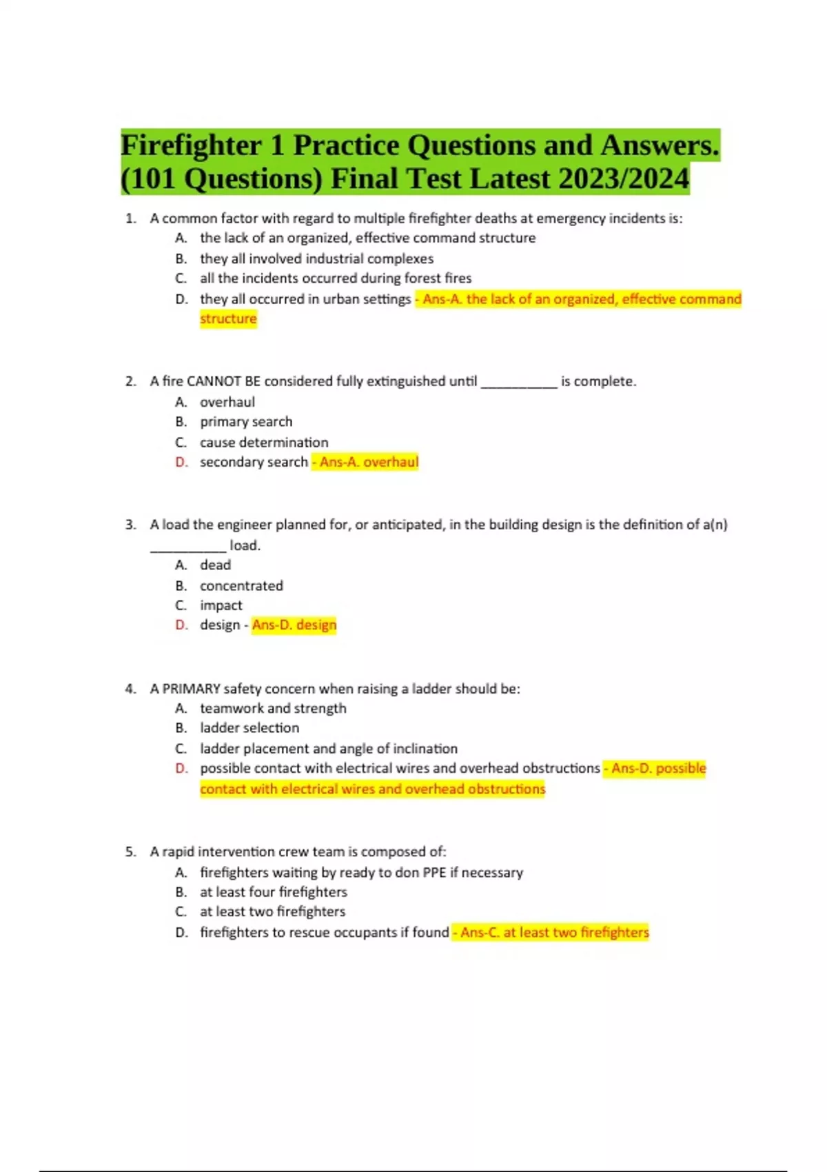 Firefighter 1 Practice Questions and Answers (101 Questions) Latest 2023/2024 | 100% Verified. A load the engineer planned for, or anticipated, in the building design is the definition of a(n) __________ load. A. dead B. concentrated C. impact D. design - Ans-D. design 4. A PRIMARY safety concern when raising a ladder should be: A. teamwork and strength B. ladder selection C. ladder placement and angle of inclination D. possible contact with electrical wires and overhead obstructions - Ans-D. possible contact with electrical wires and overhead obstructions 5. A rapid intervention crew team is composed of: A. firefighters waiting by ready to don PPE if necessary B. at least four firefighters C. at least two firefighters D. firefighters to rescue occupants if found - Ans-C. at least two firefighters Firefighter 1 Practice Questions and Answers. (101 Questions) Final Test Latest 2023/2024 6. A stream discharging MORE than 350 gpm is known as a/an ___________ stream. A. master B. booster C. solid D. elevated - Ans-A. master 7. Adults who try to escape a fire on their own are often found in one of two locations. One of those is: A. in a closet B. in the attic C. near a door D. in the middle of a room - Ans-C. near a door 8. After a roof has been opened up, the firefighter must: A. remove any natural roof openings B. make another opening on the opposite side of the pitched roof C. ensure the ceiling below the cut is opened D. direct a hose line into the opening - Ans-C. ensure the ceiling below the cut is opened 9. An attack that uses the steam-generating techniques of a ceiling-level attack, along with application of the fire stream on a material burning near the floor level, is known as a(n) _________attack. A. blitz B. direct C. indirect D. combination - Ans-D. combination 10. Another term for the spread of a fire to exposed buildings is: A. attenuation B. mitigation C. trepidation D. extension - Ans-D. extension 11. Class C fires involve: A. metals B. energized electrical equipment C. flammable liquids D. combustible materials - Ans-B. energized electrical equipment 12. CO2 and dry chemical extinguishers will extinguish both Class B and C fires. What advantage does CO2 have over a dry chemical extinguisher? A. CO2 is effective at a greater distance B. CO2 will prevent reignition longer than dry chemical extinguisher C. CO2 does not leave a residue or corrode electrical contacts D. CO2 is not a hazard in an enclosed area - Ans-C. CO2 does not leave a residue or corrode electrical contacts 13. Due to rapid cooling, when water is applied to masonry walls the firefighter should look for possible: A. cracking B. sudden wall collapse C. discoloration D. additional fire extension - Ans-A. cracking 14. During _________, conditions in the compartment change very rapidly. A. growth B. rollover C. fully-developed D. flashover - Ans-D. flashover 15. During a two-firefighter raise of a single ladder, it is the responsibility of the _________ to determine the proper placement distance from the building. A. incident commander B. driver/operator C. firefighter at the butt (heeler) D. company office - Ans-C. firefighter at the butt (heeler) 16. During the response phase of an emergency incident, two aspects of a property are particularly important. One of those is building layout and the other is: A. access information B. water supply type C. location of any activated sensor heads on the suppression system D. location of riser valves on the detection system - Ans-A. access information 17. Firefighters must use care in checking attic spaces with blown-in insulation because: A. the spaces may be small and difficult to work in. B. some types of insulation can cause skin irritation C. embers can smolder in insulation for many hours before igniting D. heated surfaces will not be detected with thermal imagers - Ans-C. embers can smolder in insulation for many hours before igniting 18. Firefighters should possess all of the following characteristics EXCEPT: A. professional pride B. integrity C. personal motive D. courage - Ans-C. personal motive 19. For an area to qualify as a light hazard, the majority of materials must meet one requirements. One of those is that they must: A. be UL listed B. have ignition temperatures in excess of 451F C. be necessary for the work of the area D. be noncombustible - Ans-D. be noncombustible 20. Forcible entry tools can be grouped into several categories. One is: A. grinding B. twisting C. crushing D. striking - Ans-D. striking 21. Heat can travel throughout a burning building by one or more of the following methods: A. extension, conduction, and exposure B. conduction, radiation, and convection C. conduction, radiation, and expansion D. convection, extension, and expansion - Ans-B. conduction, radiation, and convection 22. How are flammability limits and explosive limits related? A. Explosive limits are used to calculate flammability limits B. The two terms are neither mathematically nor conceptually related. C. They are interchangeable terms meaning the same thing D. Flammability limits are used to calculate explosive limits - Ans-C. They are interchangeable terms meaning the same thing 23. How should an unconscious child be carried down a ladder? A. Over one shoulder B. Across the shoulders C. Cradled across the rescuer's arms D. Vertically, in the crook of one arm - Ans-C. Cradled across the rescuer's arms 24. In addition to their use in actual emergencies, preincident plans can also be useful as an aid in: A. law enforcement B. budget development C. personnel selection D. training activities - Ans-D. training activities 25. In most cases, the contents of a building will be predicated by the: A. geographical area B. occupancy type C. time of day D. construction type - Ans-B. occupancy type 26. In order to extinguish smoldering mattresses during overhaul, they should be: A. stood up and allowed to burn out B. ripped open with a chainsaw or similar tool and wet thoroughly C. re